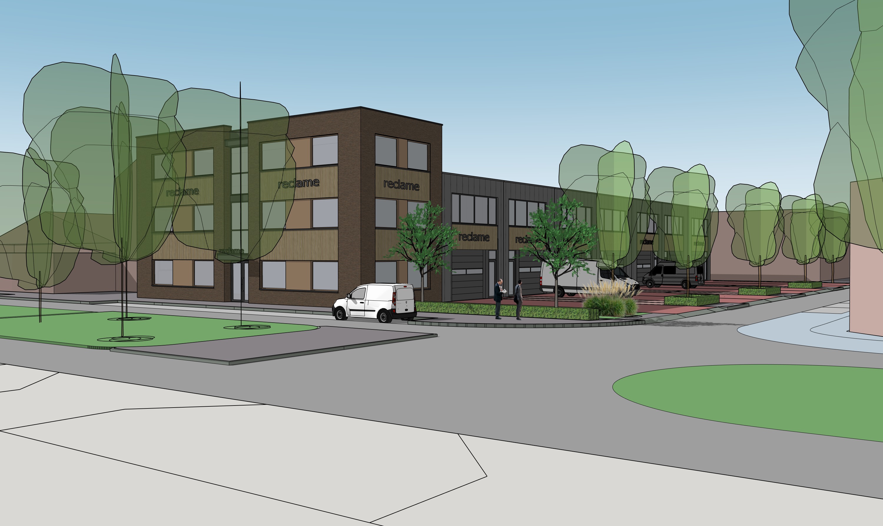 the weather is sunny with a few clouds in the sky add some people and cars arund the building behind the glass of the building there are some offices visible