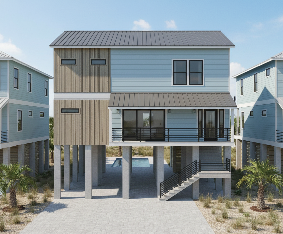 create a photorealistic front facing rendering of a two story elevated modern coastal home exactly matching the provided architectural elevation the image must be viewed from the front of the home straight on or at a slight angle no rear or aerial perspective architecture structure the entire underside of the home must remain completely open supported only by exposed concrete pilings no enclosed walls no storage no built in features the front face of the home must be 38 feet long and the depth of the home must be 28 feet wide the front view must show exactly 6 evenly spaced concrete pilings and the side depth of the home must show exactly 3 concrete pilings upper level exterior light blue horizontal siding with two double hung windows lower level left wall section above flood elevation natural or weathered vertical wood slat paneling all window and door frames including both doors and sliders must be black for a strong modern contrast roof must be a gable roof only no hip roof finished in galvanized or matte gray standing seam metal with the same pitch on both the main roof and porch roof balcony and stairs must feature black horizontal railings hardscape landscaping install a solid paver driveway in light gray or ivory pavers extending beneath the home and into the backyard landscaping should be minimal and clean with sparse coastal grasses and dwarf palms pool placement visible behind the home the swimming pool must be located directly in the backyard behind the home visible in the background of the front facing rendering pool requirements perfect rectangle positioned parallel to the back of the home exactly as wide as the home spanning the full 38 foot width from one side to the other surround the pool with the same paver material as the driveway setting location place the home on a dry inland lot on fort myers beach no ocean or beach in view show neighboring elevated coastal style homes consistent with the surrounding neighborhood lighting bright florida coastal daylight clear blue sky crisp shadows overall aesthetic modern florida coastal stilt home with scandinavian minimalism shown from a front street perspective with a 38 foot fa ade 28 foot depth 6 concrete pilings across the front 3 concrete pilings in depth and a visible backyard pool