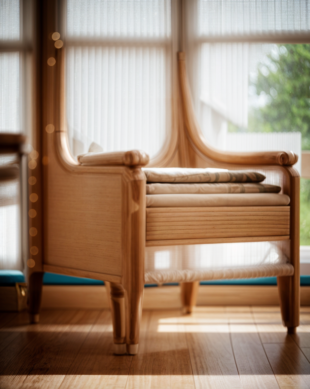 modernist perspective shot weaving inspired chair wooden legs finish architecture