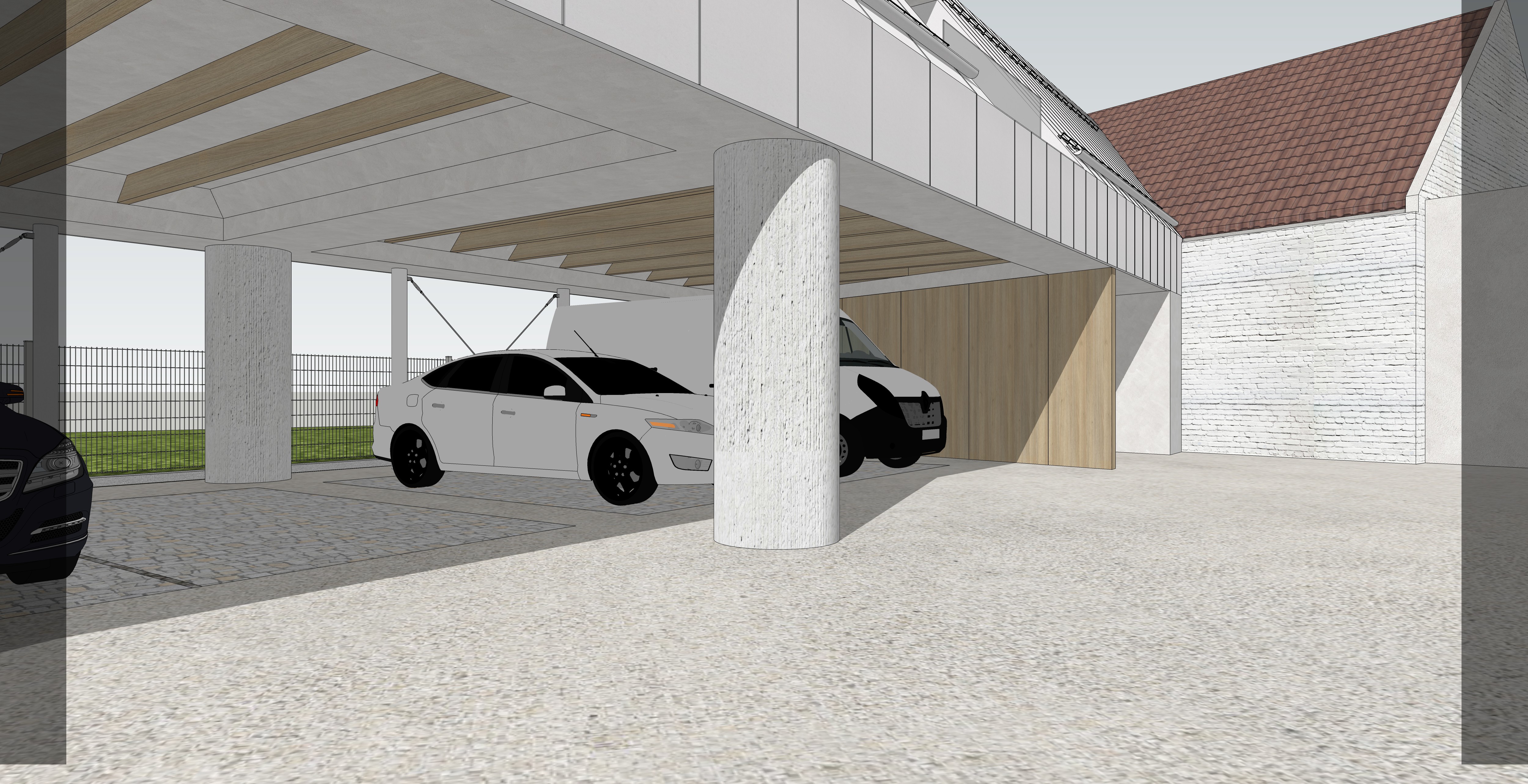 photorealistic visualization roof material white sheet metal columns concrete greenery real grass winter lights and clouds walking area interlocking paving stones granite grey