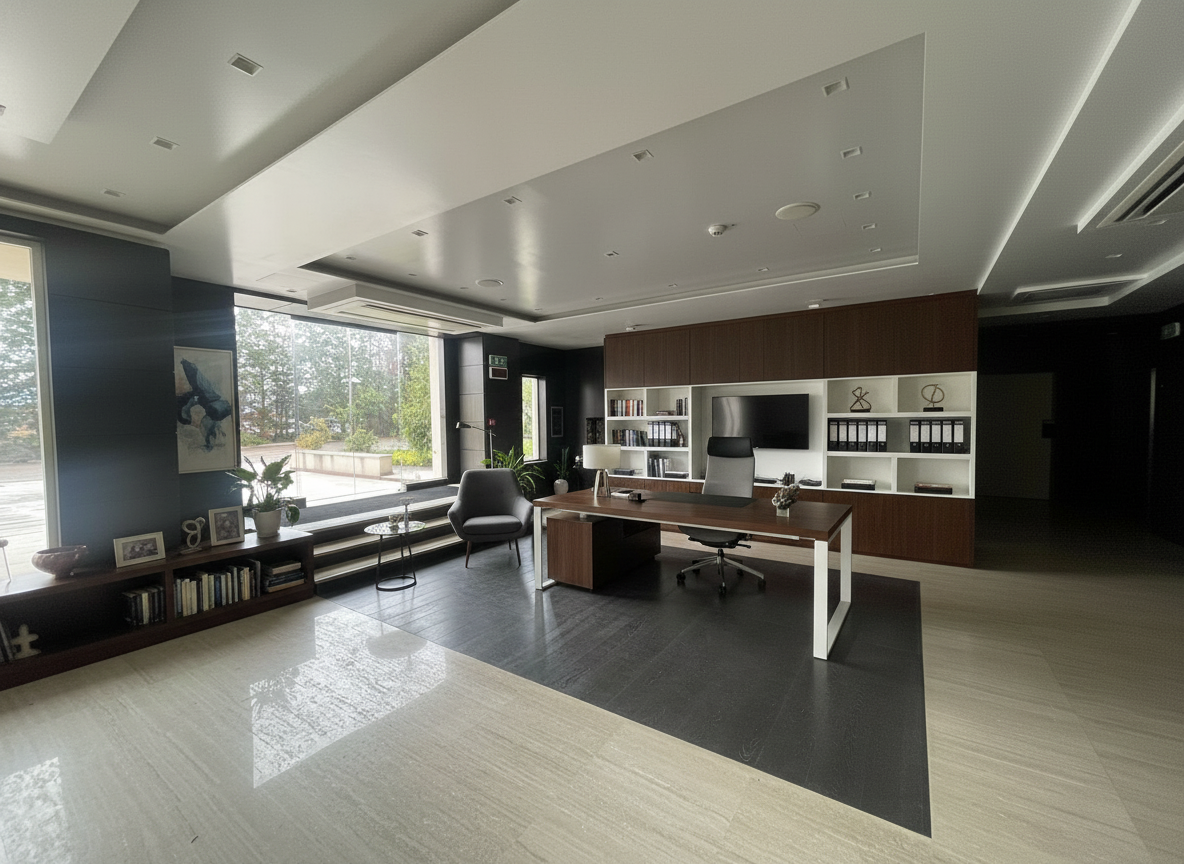 international style interior shot create a photorealistic interior visualization based strictly on the provided image do not add remove or modify any elements materials furniture or layout do not add any new windows anywhere else do not place windows on other walls ensure the sunlight reflection on the glass is smooth and continuous without any grid lines or breaks maintain correct scale and proportions use physically accurate lighting with soft global illumination all lamps are turned on and emit warm light with visible light sources keep natural exposure consistent with the original image use high quality realistic textures with precise detail ensure accurate reflections and soft shadows do not apply any stylization or artistic effects the result must be strictly photorealistic and match the original scene as closely as possible add evenly spaced surface mounted white one spotlight to the ceiling with a simple modern design and make sure the lights are turned on emitting soft natural lighting dont do sun reflection architecture