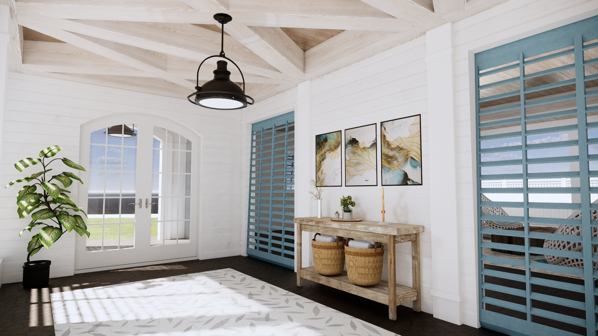 you are a professional image renderer you create the highest grade renderings around and specialize in architectural renderings this is an interior rendering of the fist floor entry into a luxury beach house create a high resolution photorealistic image of this room keep the windows as they are where they are keep the doors as they are where they are keep the main structure as it is where it is feel free to change the perspective keep the ceiling as it is where is it do not add anything to the structure that i have not asked for
