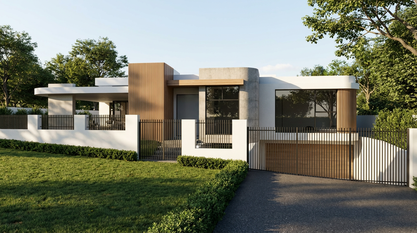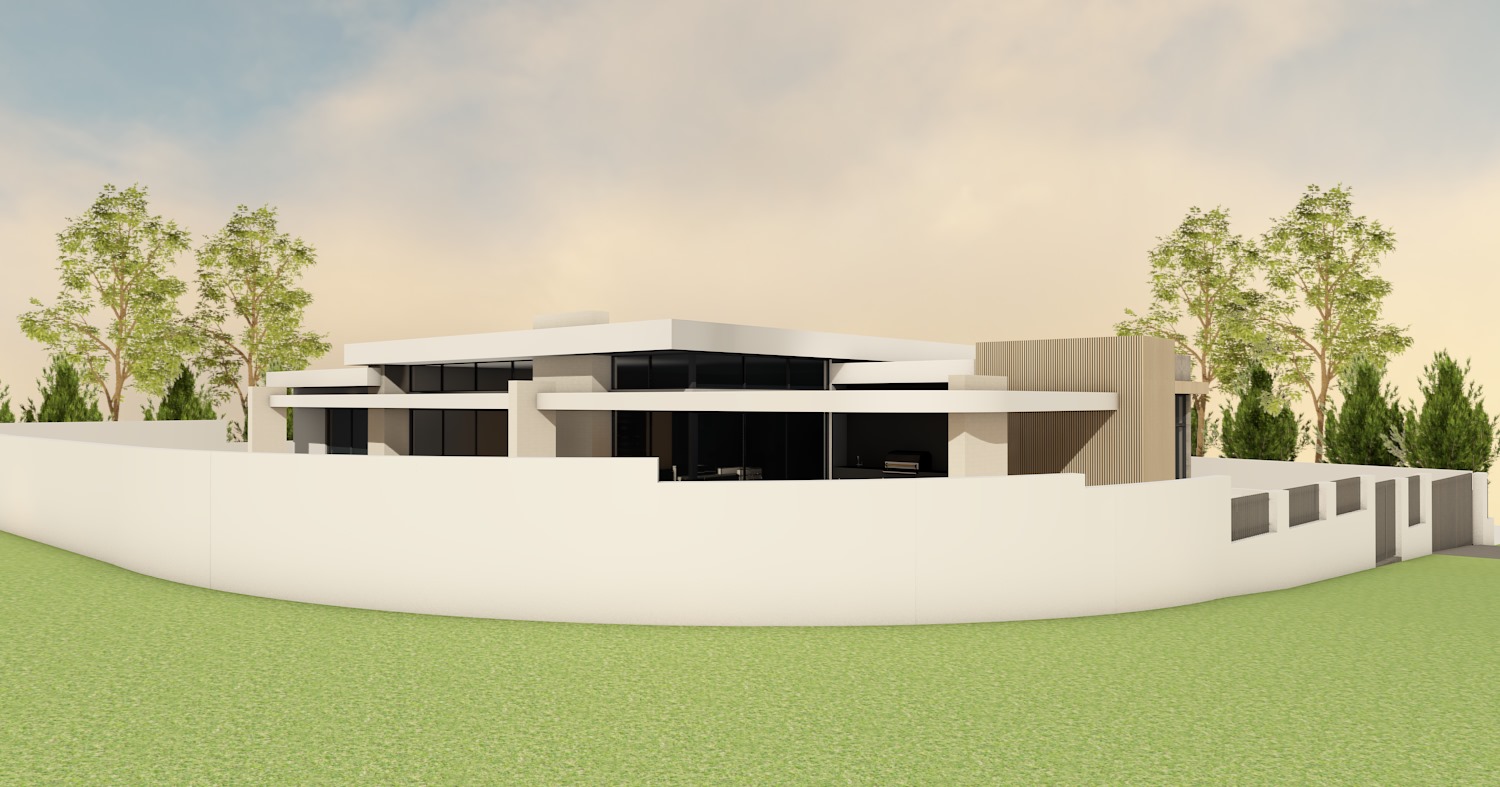 sunny afternoon very low hedges on ground surrounding trees white stone cladding on piers in background
