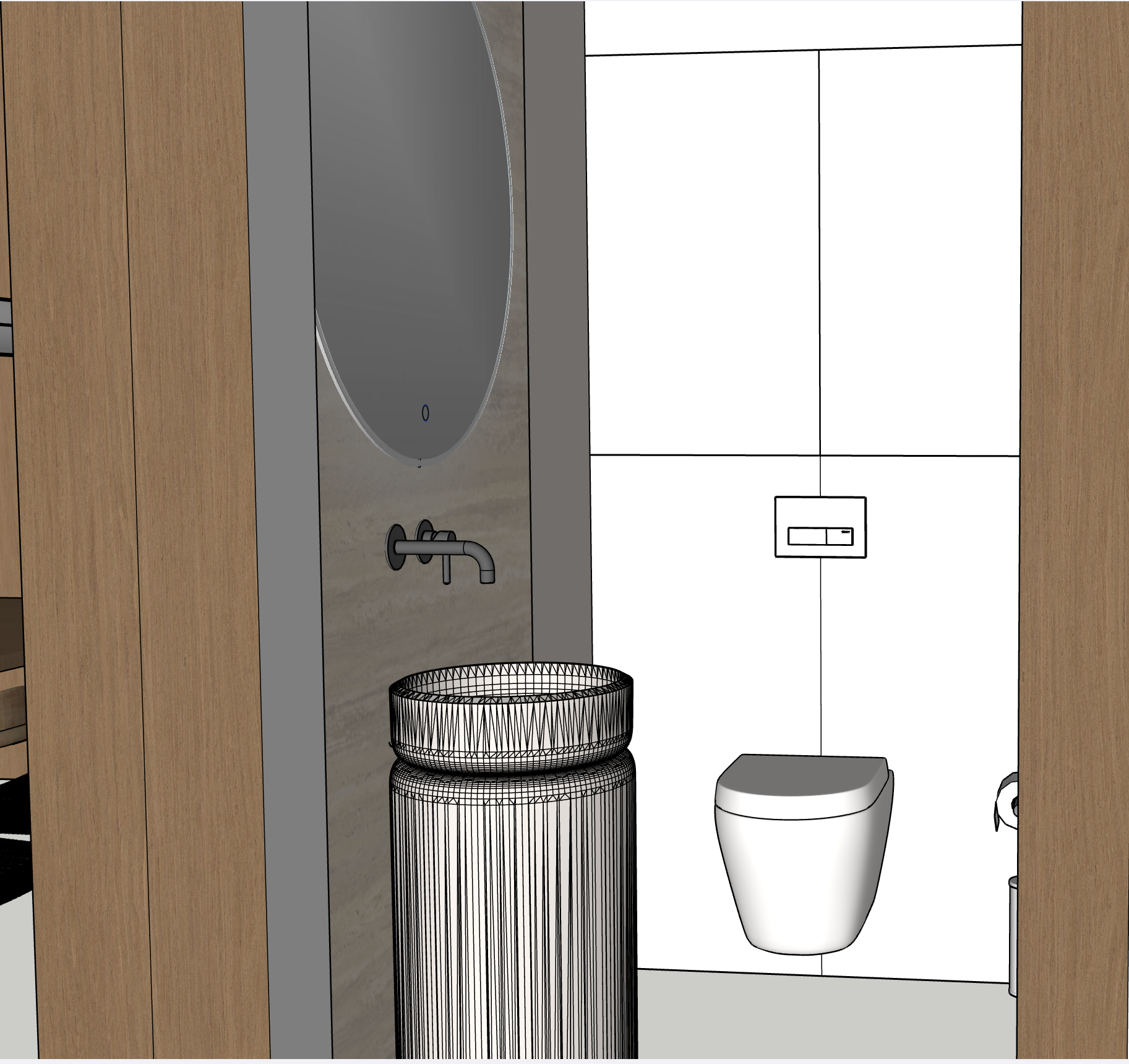 wc wall is veener ncs 1002 y50r behind the mirroe travertine sink is massi beige