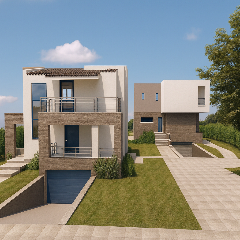 render a modern minimalist suburban house in a picturesque setting the house features a blend of white and beige tones on the walls with dark gray and earthy brown accents incorporate a sleek deep blue door and matching garage use clear azure blue skies with soft fluffy clouds to create a peaceful atmosphere the landscape includes lush vibrant green grass and dense green shrubs complemented by elegant stone pathways in light gray add tall realistic trees with rich green foliage creating a serene and inviting environment