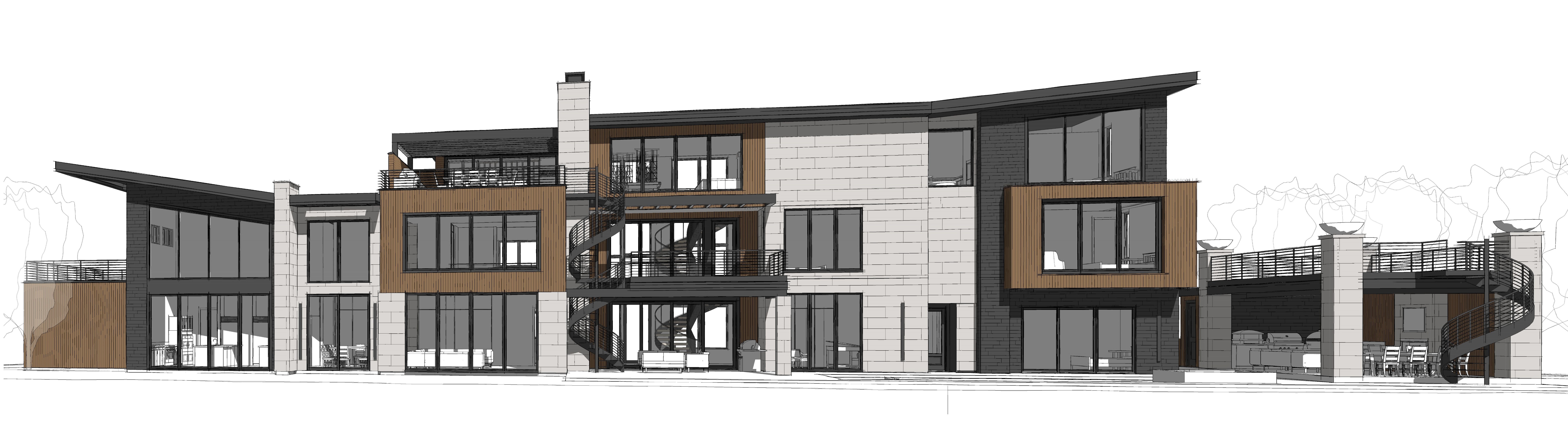 stone is a smooth limestone grey is a black slate and wood is a monotone vertical wood lake in foreground with painted metal seawall