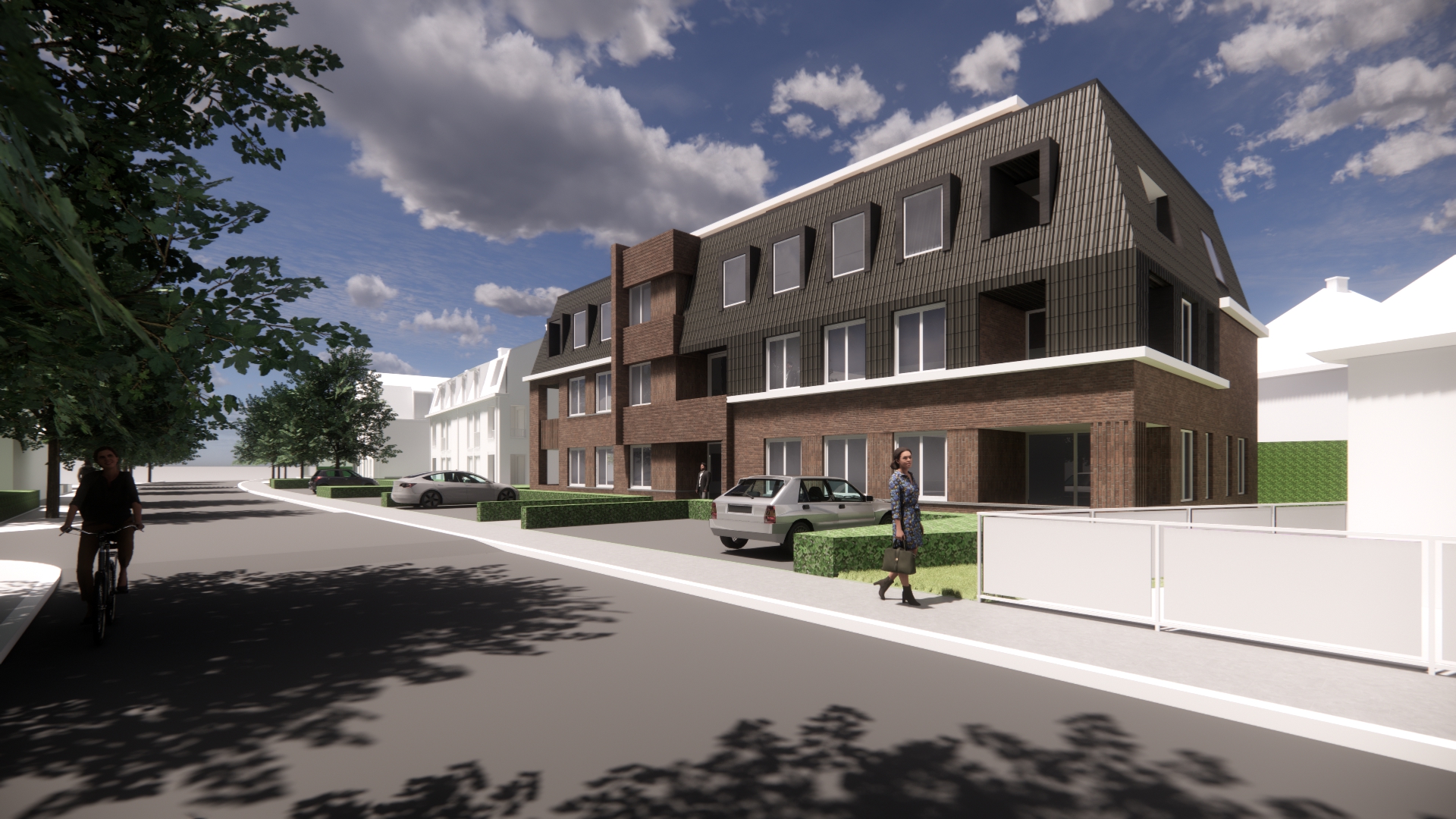 make this rendering more realistic with better street and sidewalk also better hedges and typical jaren 30 rooftiles
