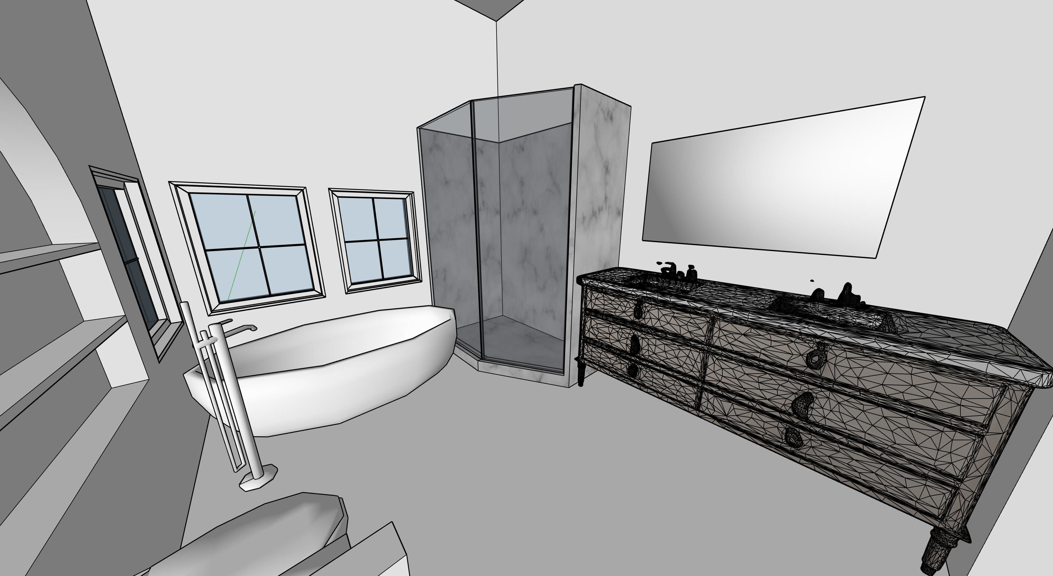 finish the render make it a fall day outside shower and floor white marble with dramatic veins brass hardware