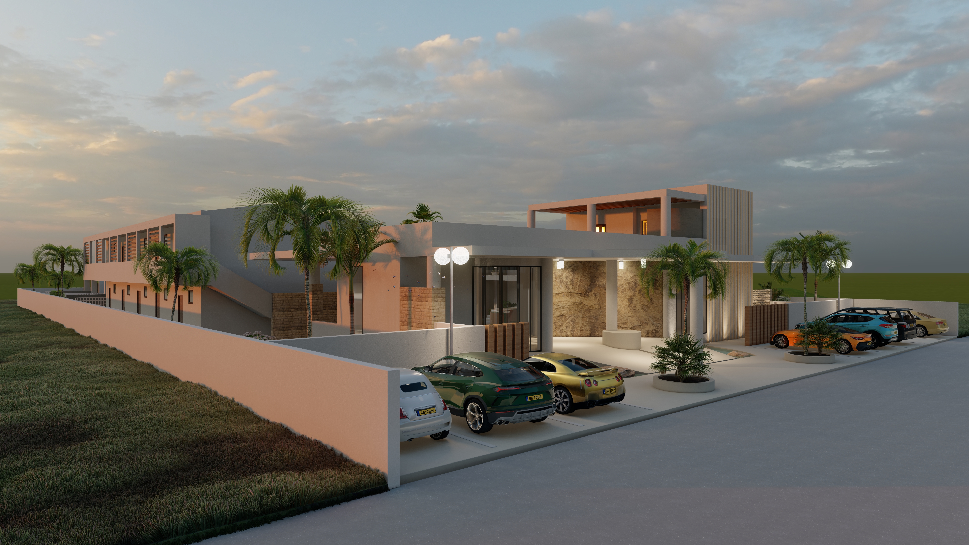 create a modern architectural rendering of a large luxurious building with a minimalist design featuring clean lines and a sleek facade the building is surrounded by vibrant green palm trees adding a tropical touch in the foreground a row of luxury cars including a white green gold and blue vehicle line up in a driveway the exterior walls are a sophisticated blend of soft pink and gray hues with warm lighting highlighting the textures the atmosphere is set during a serene sunset with the sky painted in shades of soft oranges blues and grays creating a calm and inviting ambiance the foreground grass is lush and well maintained leading to a smooth light gray pavement capture the scene with an elegant tranquil and contemporary aesthetic