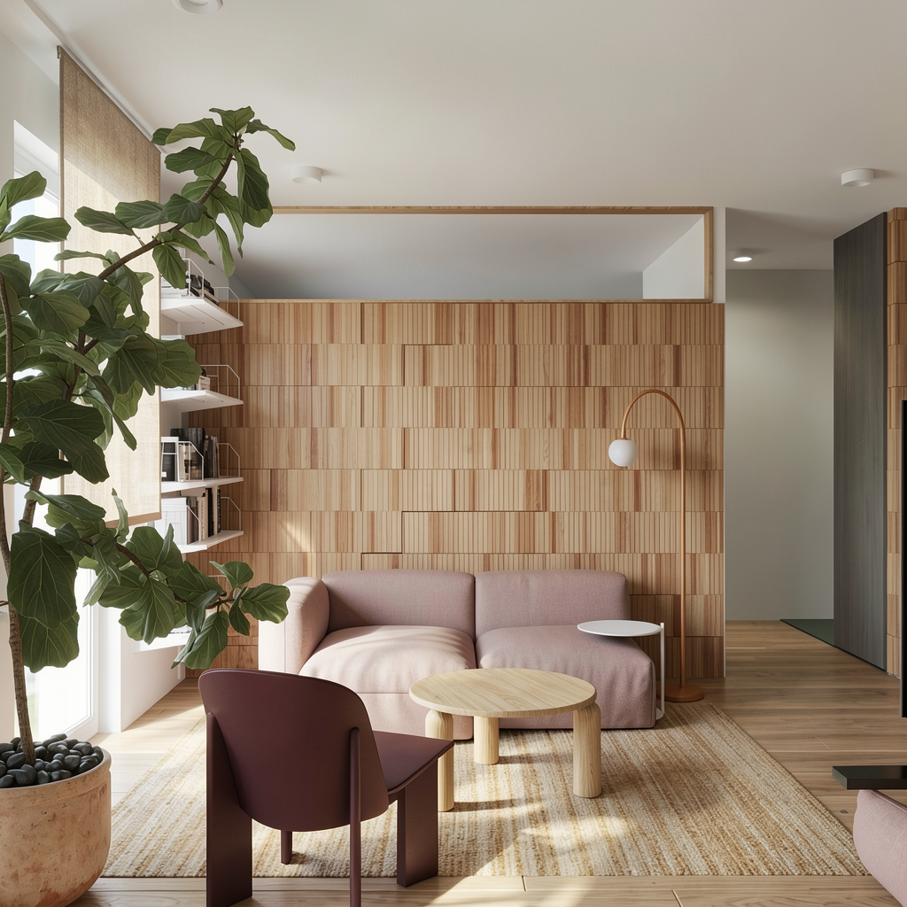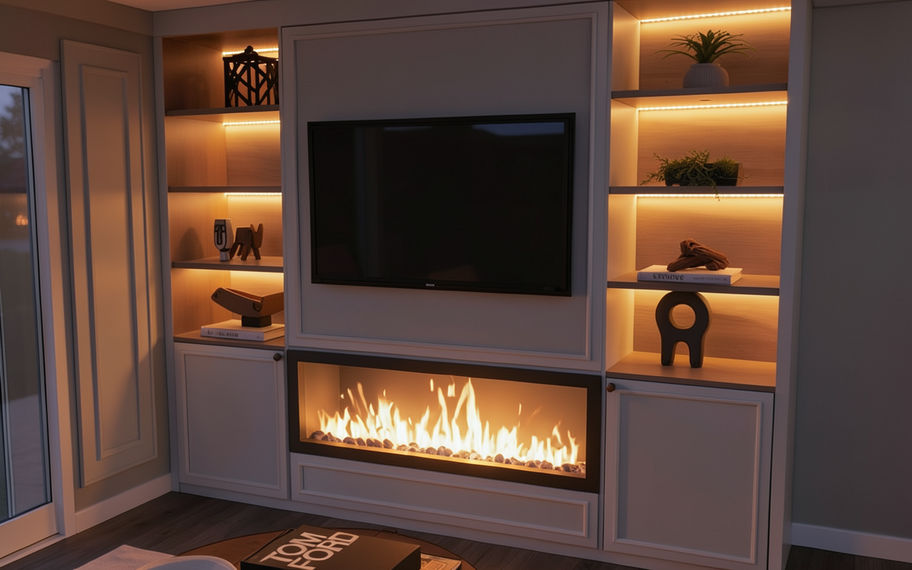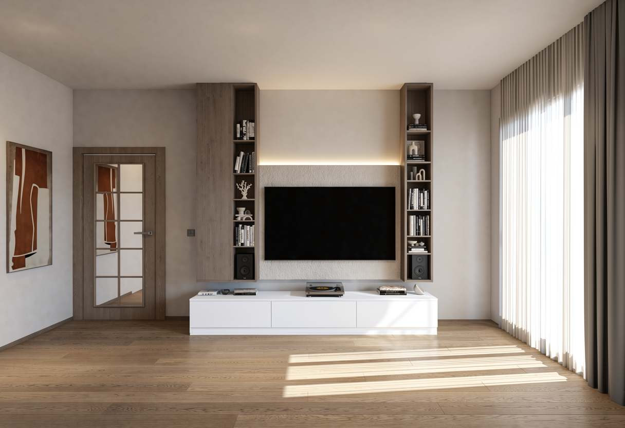 edit the image while keeping the entire interior and composition unchanged move the two tall upper shelving units left and right of the tv wall upward by approximately 15 cm so that they are slightly higher on the wall add a subtle warm white led strip light along the bottom edge of both upper shelving units the led should be integrated and hidden in a small profile so the light softly washes the wall and the tv panel below lighting should be soft indirect ambient lighting with realistic glow and natural falloff on the wall surface keep everything else exactly the same tv position lower cabinet shelves layout books speakers decor walls door curtains floor sunlight and shadows maintain photorealistic architectural render quality global illumination soft shadows realistic materials and balanced exposure