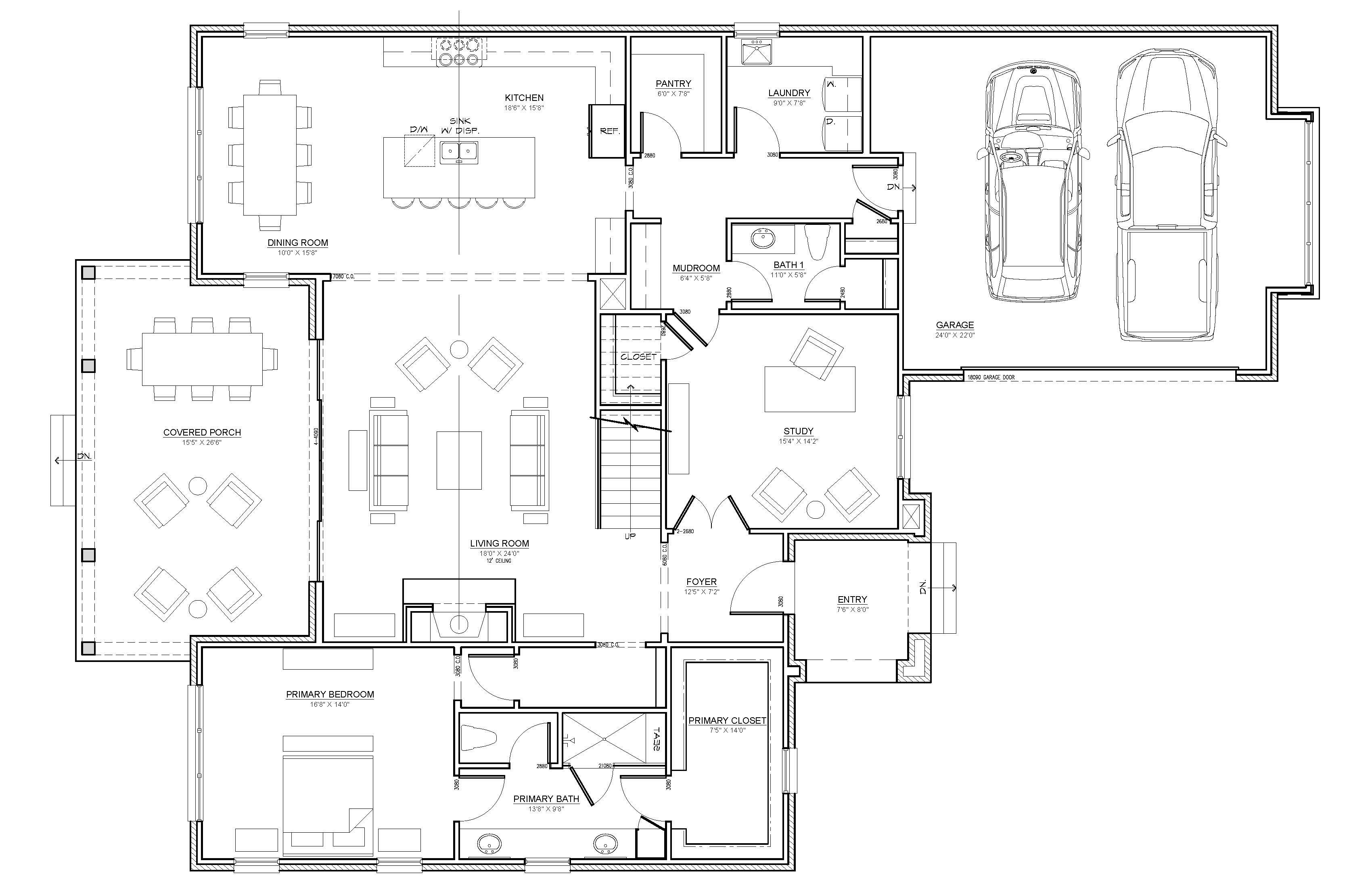 convert this floor plan into a realistic isometric 3d view of a full house show the space from an elevated angle with furniture walls and details visible remove washer under window in laundry room make foyer an exterior porch make flooring on backporch stone use the same furniture as shows on the plan do not change the orientation of the floorplan