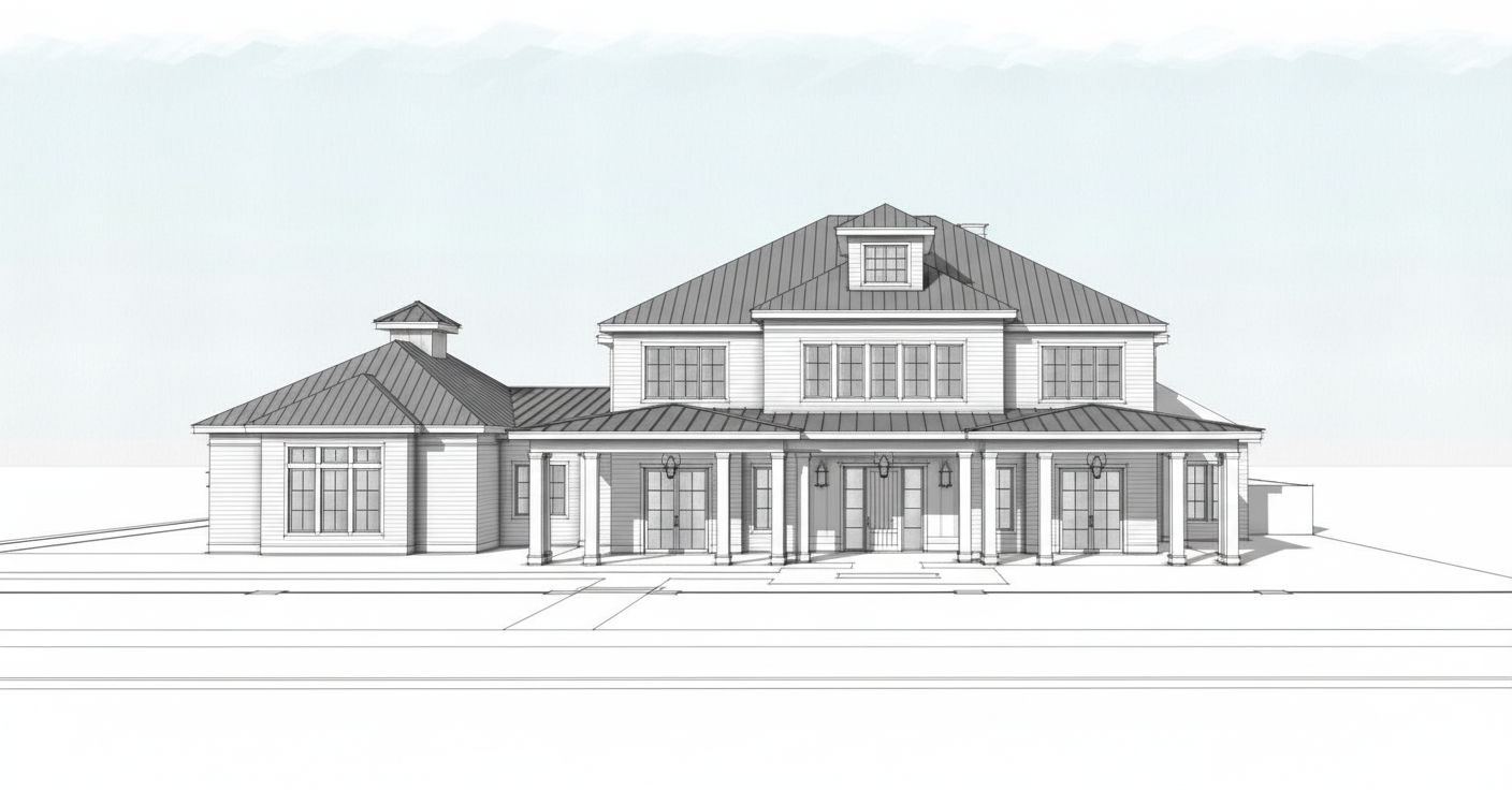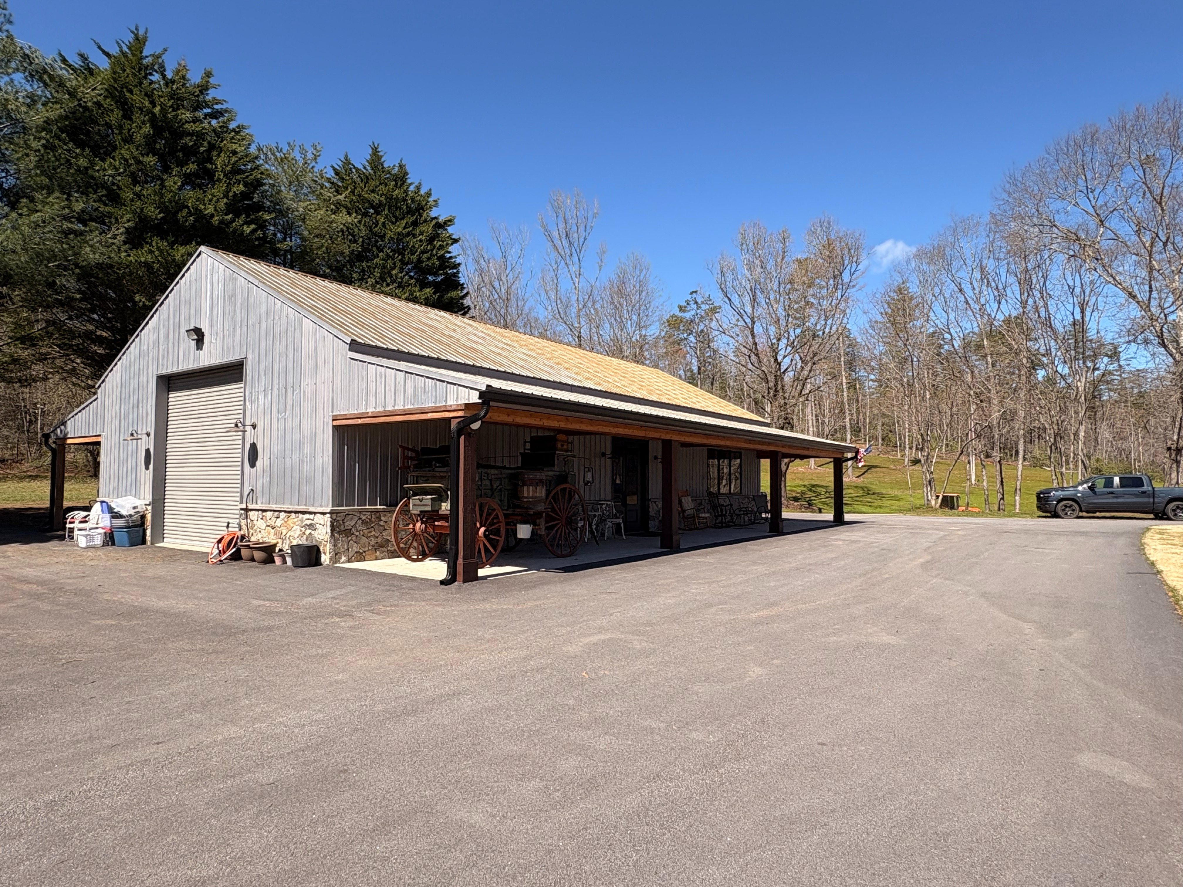 modify to show more planting around the perimeter modify garage door on left of image to be large glass windows and doors with an awning and seating underneath add rustic sign outside that says armory have people walking around outside some holding a long gun add signage that say armory maye building feel luxurious