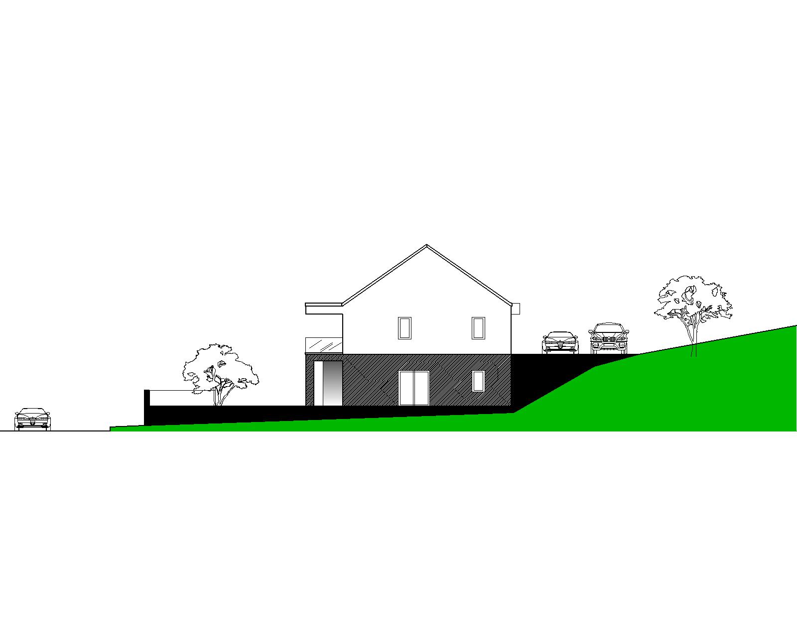 exterior shot white smooth facade combined with grey on the hill forest behind and grass in front sunny with clouds glass fence grey windows trees architecture
