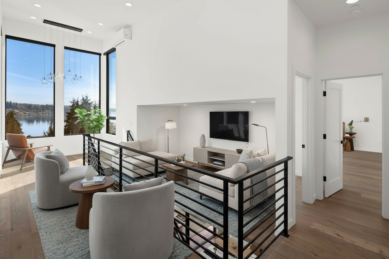 add a simple natural piece of art to the big wall and change the plan to another comfortable chair