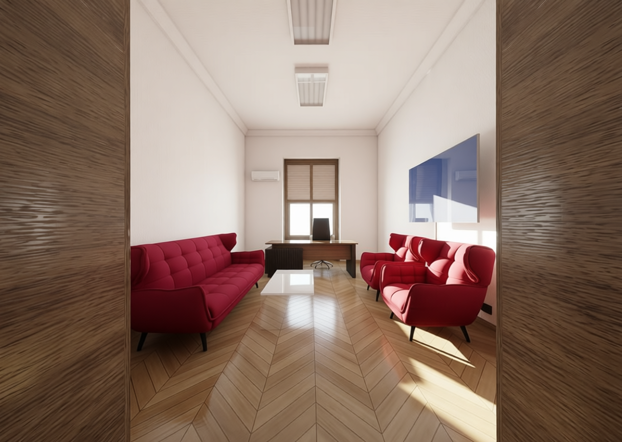 virtually stage the provided interior render of a director s office in a modern scandinavian minimalist style preserve all existing architecture camera angle lighting proportions and all built in elements exactly as they are do not remove replace or reposition any existing furniture or objects do not add new furniture or it equipment do not add ceiling or floor lamps do not alter the layout recolor the two existing chairs to a rich plum purple tone with realistic upholstery texture staging direction create a refined calm high end scandinavian executive office with a clean editorial look use a neutral palette warm whites soft greys light natural wood with subtle plum accents key staging elements to add tv stand area add minimal decor on and around the tv stand such as a low profile decorative object a small plant or a few neatly arranged books keep it balanced and uncluttered seating area sofa chairs plexi glass table keep the plexi glass table glass acrylic table clearly visible and styled place a small curated arrangement on the table tray candle sculptural object or a small stack of books magazines add a subtle table lamp on the plexi glass table style the sofa with minimal decorative cushions in neutral tones and optional subtle texture add one small side plant near the seating area desk area l shaped desk near the window keep the desk in its current position near the window add minimal desk styling a desk lamp a small plant a notebook or paper object a pen holder keep the desk clean and uncluttered consistent with an executive workspace wall decor add one or two large abstract artworks in a minimalist scandinavian style with neutral tones use simple thin frames light wood black or white place them with proper alignment and generous spacing textiles add a large area rug that visually anchors the seating area and partially extends toward the desk zone use a low contrast scandinavian rug with subtle texture in muted tones light beige soft grey or warm off white plants add 1 3 indoor plants one larger floor plant in a simple modern planter placed in a corner or near seating one or two smaller plants on surfaces such as the desk tv stand or side areas use minimalist matte planters ceramic or concrete overall composition maintain symmetry and balance ensure clear circulation paths and keep the space airy uncluttered and functional all added elements must be realistic properly scaled and consistent with the perspective and lighting final result should feel like a fully staged modern scandinavian executive director s office with curated decor subtle warmth and professional refinement