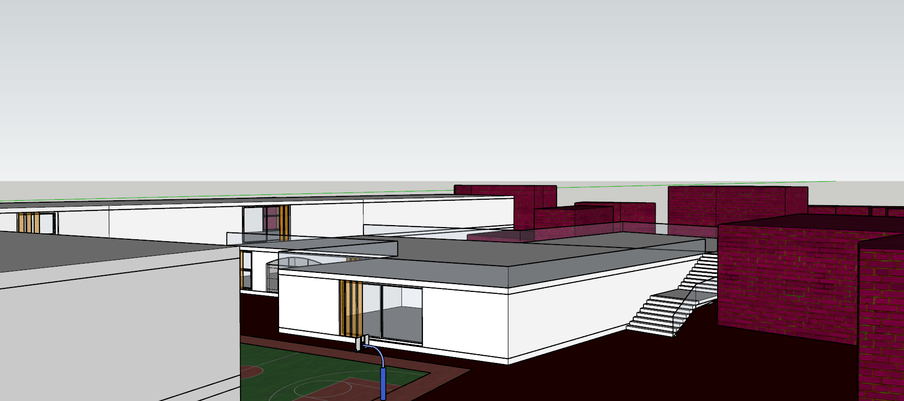 modernist exterior shot render during sunset with a basketball court and grey beige concrete walls architecture