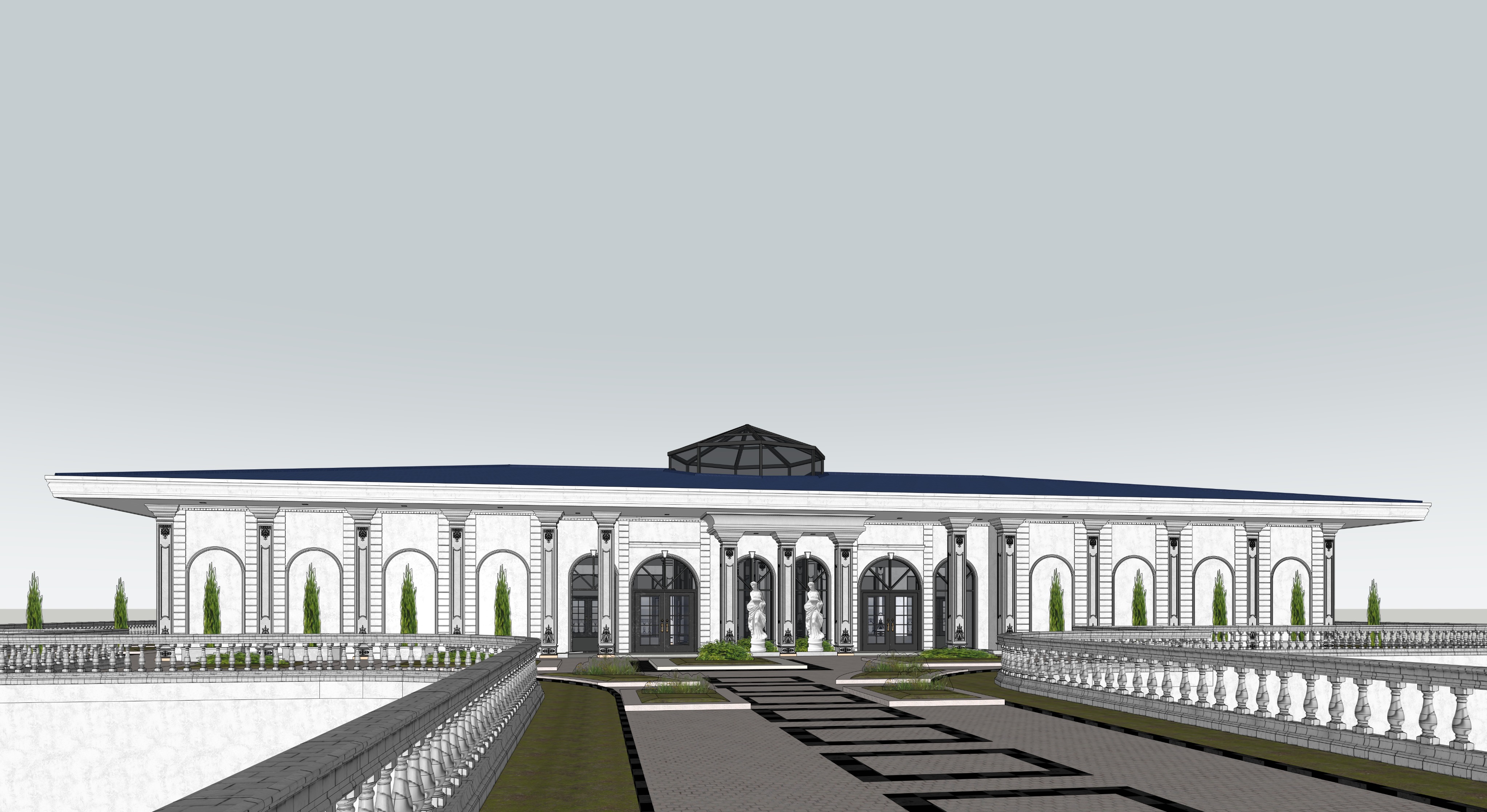 do not add put anything that is not in the prompt maintain the geometries maintain all the materials this is a french style architecture function hall building maintain the view camera position composition make this hyperrealistic add plants and flowers on the grass green areas add sea background lower the horizon line make it cinematic add some people guests attending the wedding in and out the building make it wedding vibes make it a clear weather make it super clear clean 8k quality