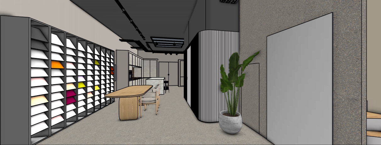 create a modern interior scene with an elegant design highlight the expansive bookshelf on the left with diverse vibrant colors whites oranges reds pinks and yellows the large wooden table in the center should have a natural light oak finish paired with cozy upholstered chairs in a soft beige tone the surrounding walls are a calm neutral light gray complemented by a sleek ceiling painted in a matte black finish with embedded ambient lighting add a touch of nature with a tall green plant in a textured gray stone pot the floor has a smooth light beige texture adding to the serene and sophisticated atmosphere the ambiance is warm inviting and contemporary