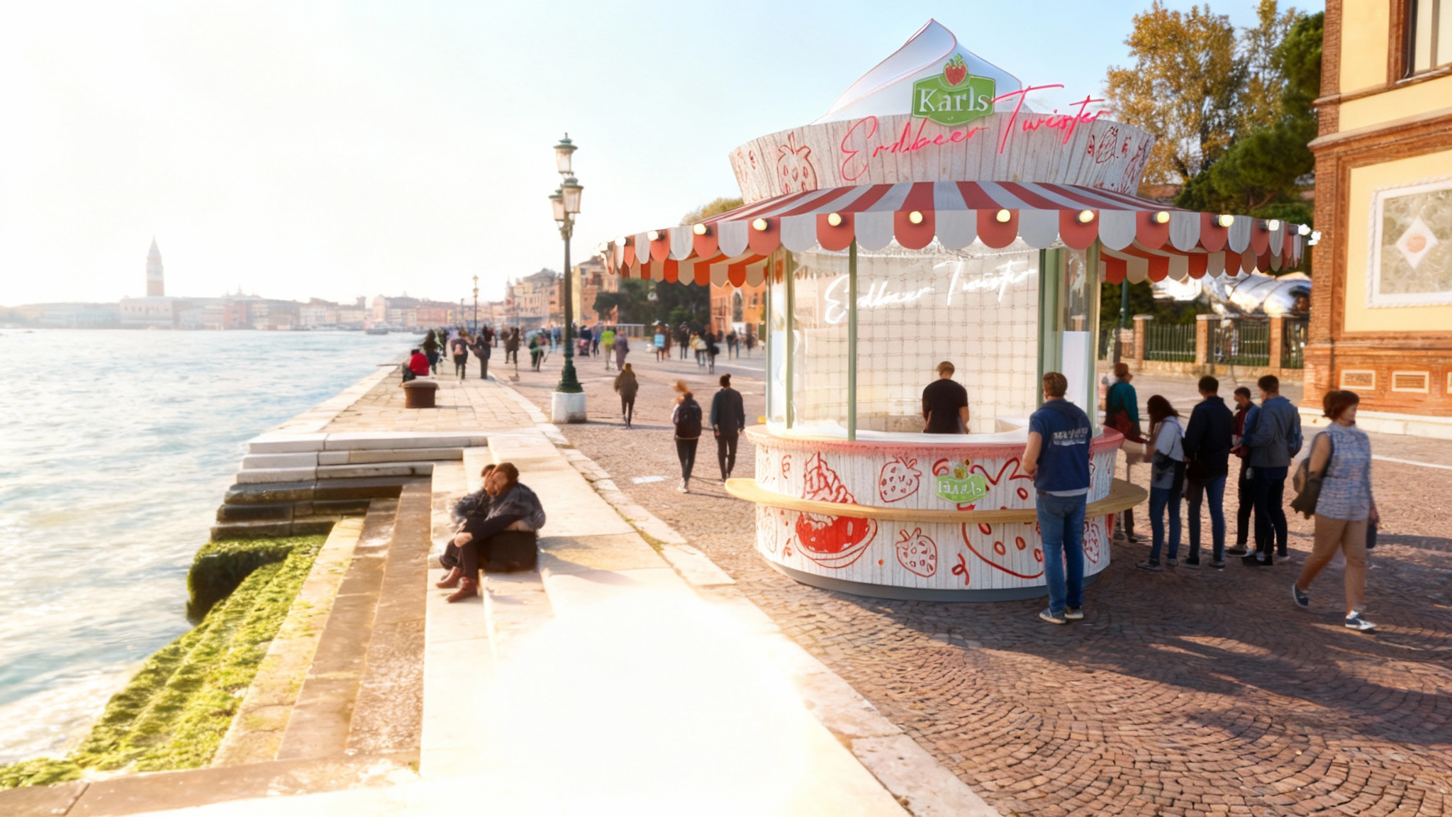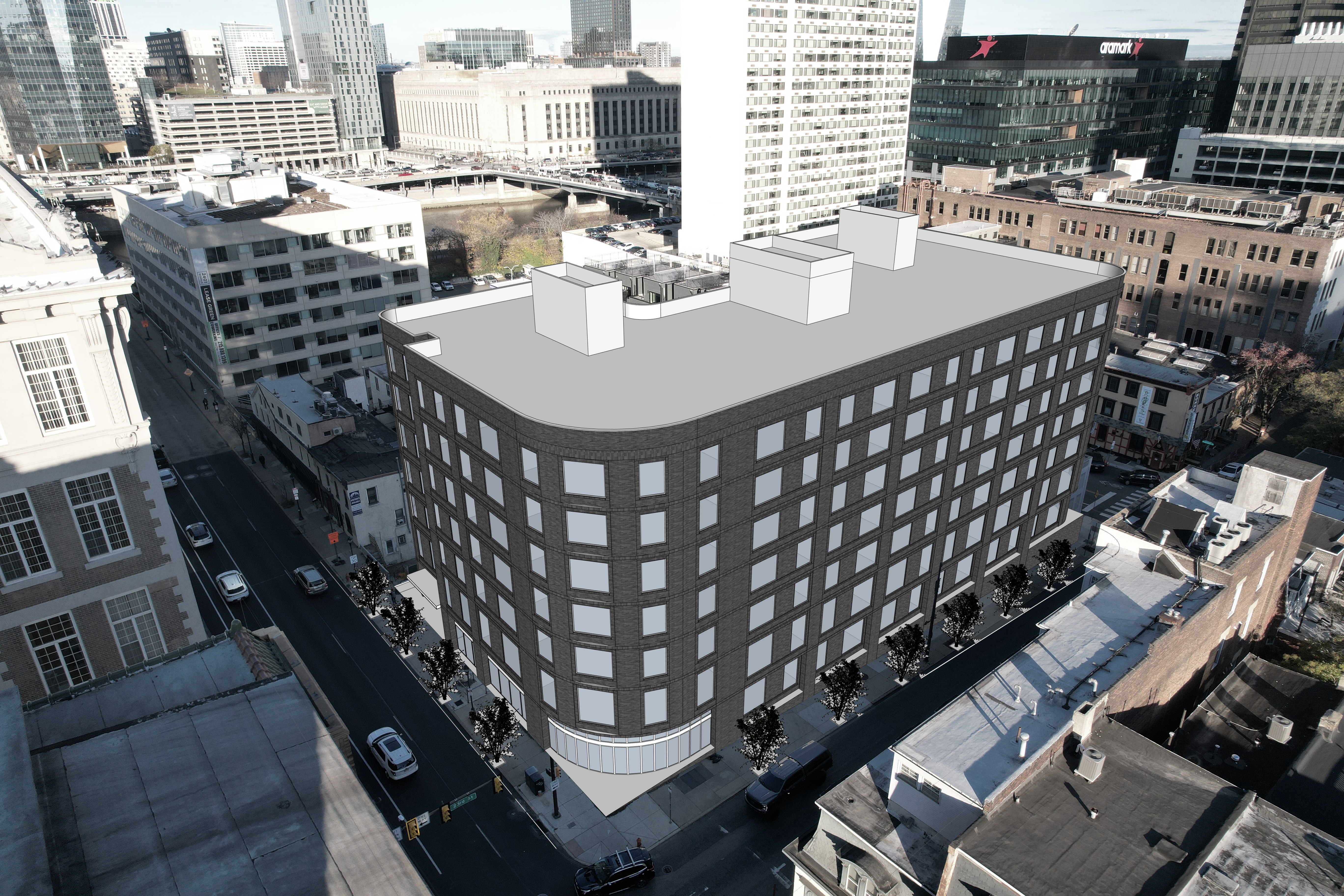 produce rendering of a warm gray brick building with contemporary brick detailing all lintels and sills should be a solider course warm gray brick windows should be black color industrial style provide curtain wall glazing at the ground level where the building curves populate scene with people cars lighting trees
