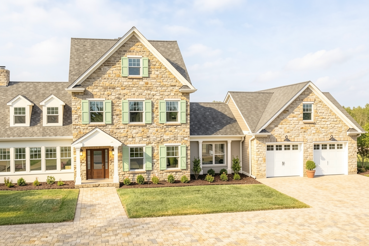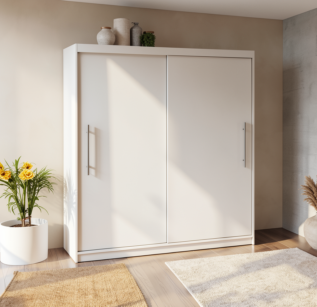 create a modern kitchen interior with a minimalist aesthetic use light eiche wood for the cabinetry with a light smooth grain pattern feature sleek grey mat countertops integrate black stainless steel appliances for a contrast that harmonizes with the wood tones ensure the window lets in bright natural daylight with a view of a clear blue sky outside include a few subtly green plants for a touch of nature design the adjacent room with a modern style incorporating soft grey furniture and an elegant white lamp maintain an overall atmosphere of calm and sophistication with neutral tones and clean lines add light led inside of the cabinets with glasses
