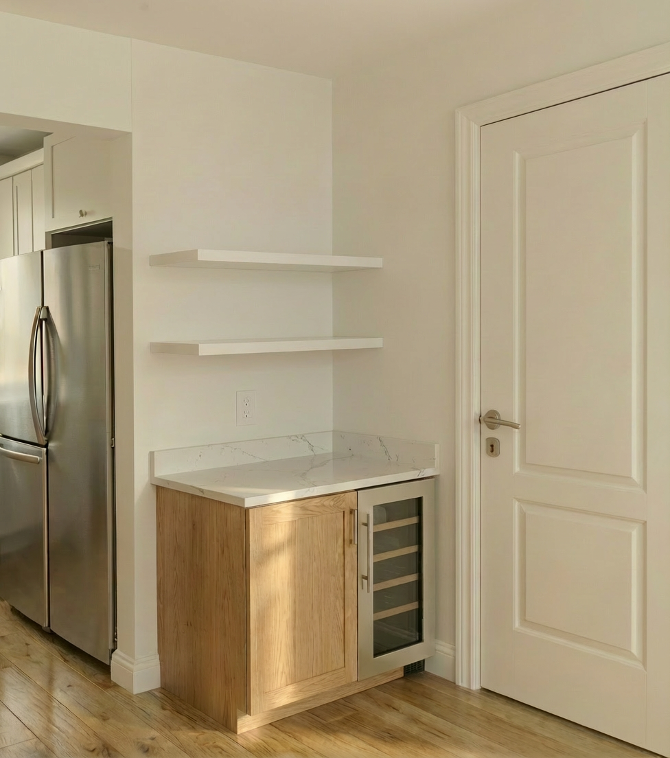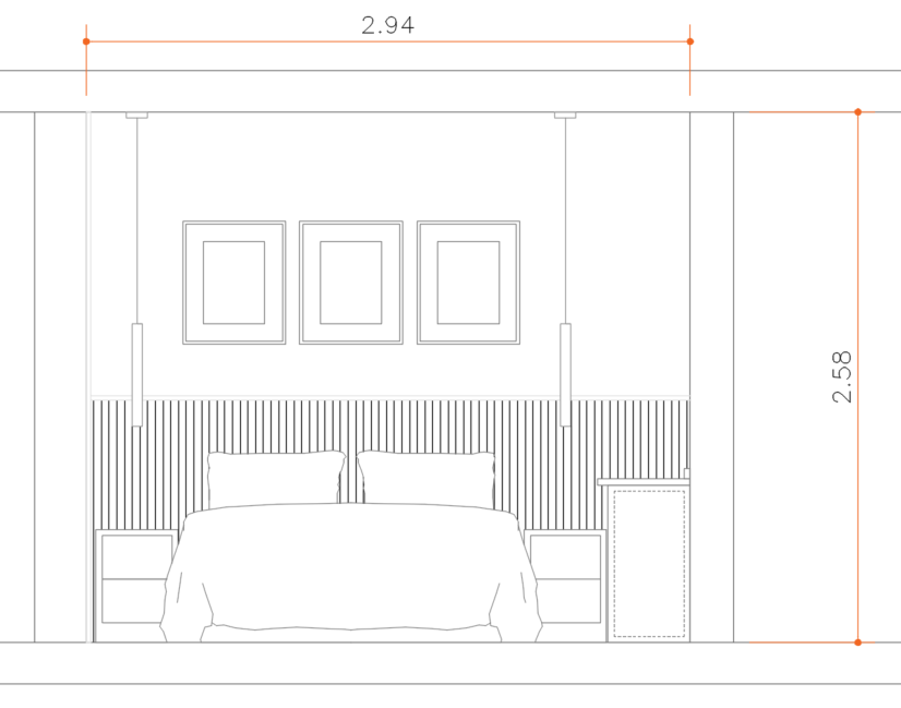vista frontal de uma parede pintada de bege muito claro na parte superior atras camaca tem revestimento ripado de madeira cor carvalho com uma tabua de acabamento horizontal pintada de branco piso em ripas de madeira carvalho dois candeeiros pendentes cor telha instalados no teto e posicionados acimas as mese de cabeceira branca edred o da cama em cinza azulado 03 quadros fixados na parede moldura tamanho 50x70 e gravura tamanho 30x40 o restante do espa o paspatu branco ao lado da mesa de cabeceira do lado diretito da imagem temos um tampo de seretaria brando vista de lado e a parte de baixo vista de frente uma pe a de recordo de vista de um armario inferior