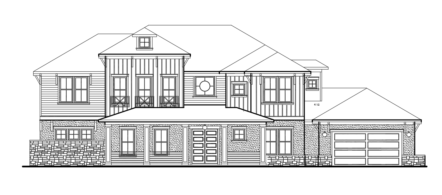 contemporary two story coastal estate featuring a stylish blend of textures and colors the exterior showcases brown stucco and contrasting beige board and batten siding the roof is weathered wood shingle with a slight sheen complementing the house s clean lines windows are framed in sleek black with reflective glass the front door is a rich mahogany with a glossy finish creating a warm entryway the stonework at the base is a mix of light gray and beige adding a natural touch accentuate the cozy atmosphere with lush tropical landscaping using palm trees tropical plants manicured hedges and soft outdoor lighting the sky is a serene evening blue with gentle fluffy white clouds creating a welcoming and tranquil atmosphere