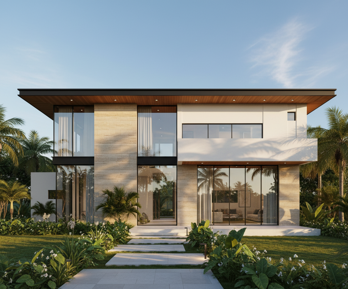 exterior shot modern balinese farmhouse exterior with flat concrete and timber roofs seamless indoor outdoor transition natural stone cladding and warm teak wood textures large glass fa ades overlooking lush tropical gardens reflection pool and soft landscape lighting open plan courtyard with water feature minimalist tropical design with earthy tones warm sunset lighting cinematic composition ultra realistic architectural render 8k photorealistic detail tranquil and elegant atmosphere