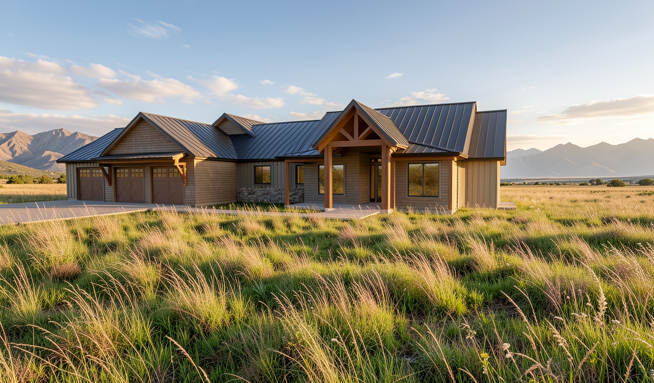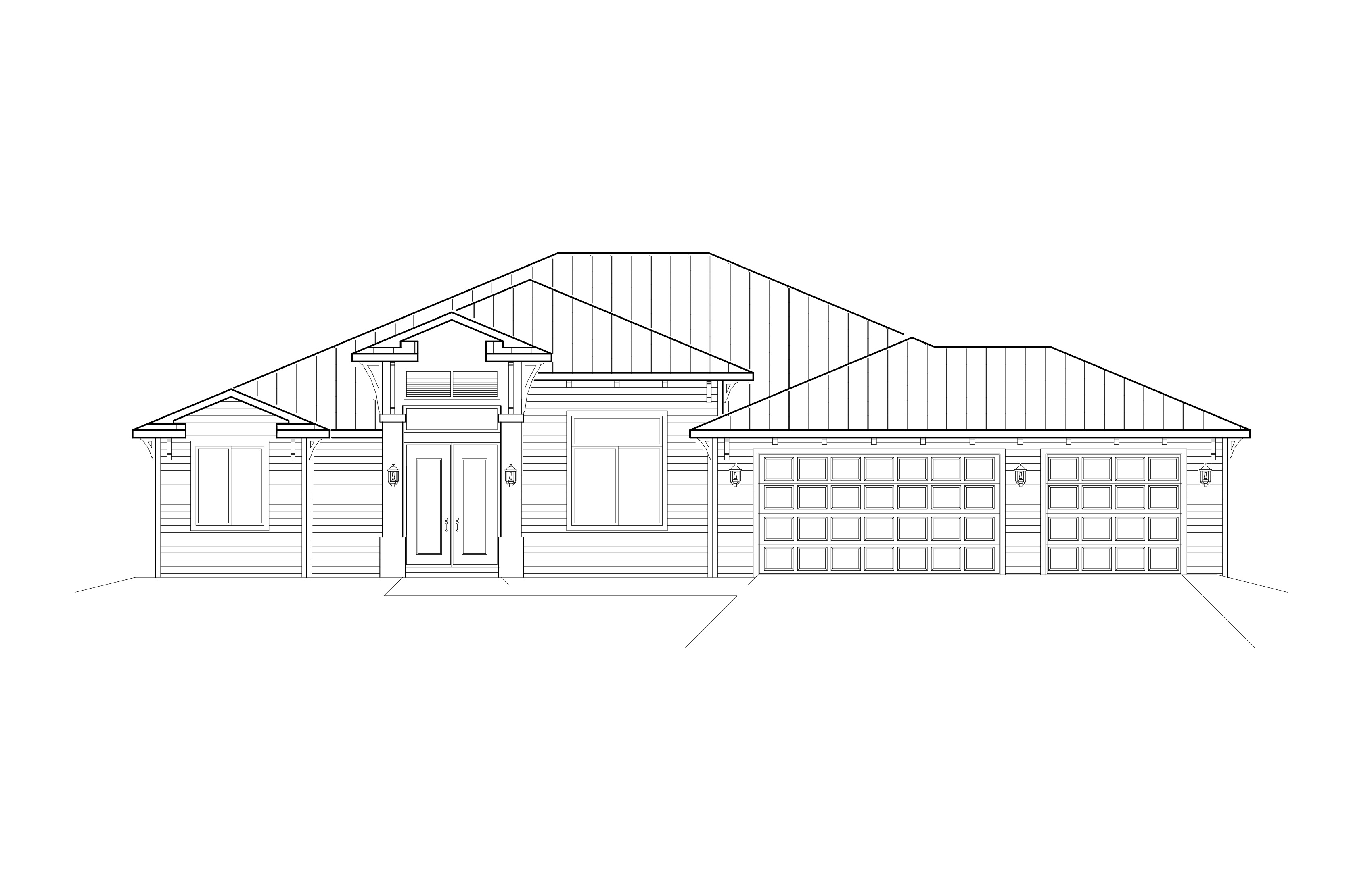 silver standing seam metal roof white fascia and soffit white trim white frame windows white garage door light yellow siding grass yard with tropical landscape large dapled gray pavers to road