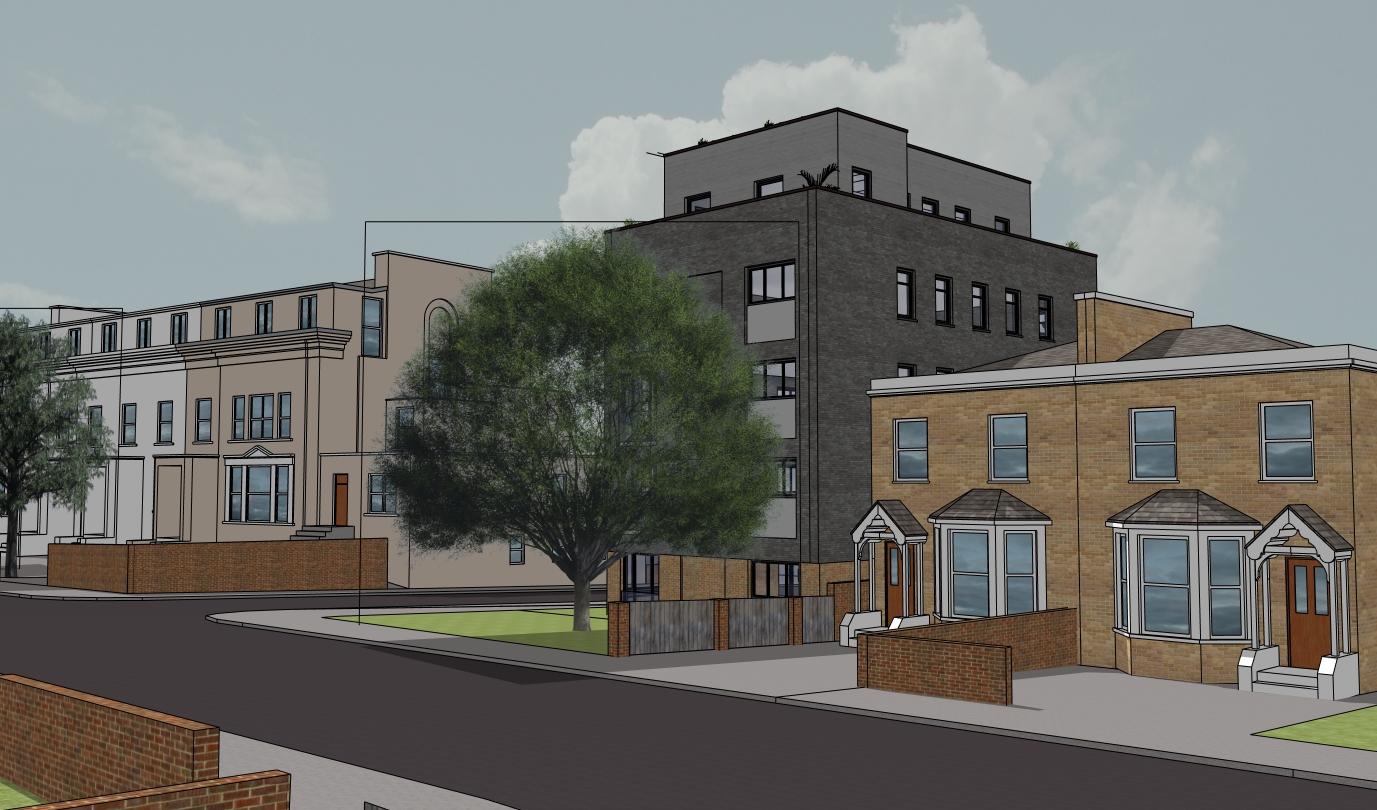 south london residential street scene blue sky and 4 people and cars