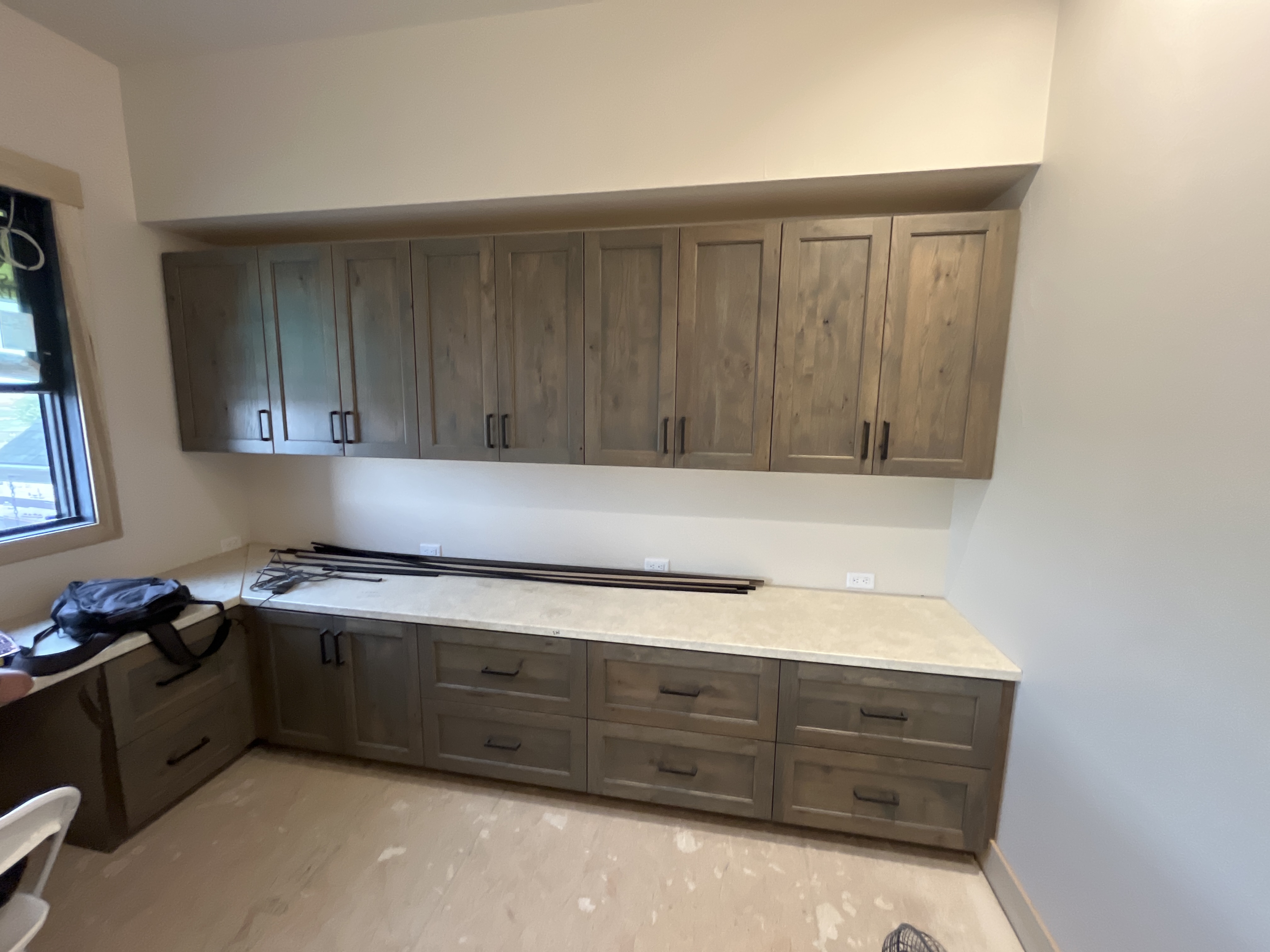 do not change the cabinets in any way preserve the exact cabinet colors materials finishes dimensions door and drawer styles hardware spacing alignment and all geometry exactly as shown do not alter the countertop shape backsplash appliances flooring lighting fixtures or wall structure only remove the construction materials clutter and mess from the scene clean the room and make it look finished and staged add a few simple tasteful home accessories appropriate for the style of the space but do not add or remove any furniture windows or architectural elements maintain the original lighting direction and realism enhance clarity and polish the photo while keeping the cabinetry and room design completely unchanged do not alter the lighting to keep the cabinet colors as they are in the image add new countertops and flooring add crown molding on the upper cabinets stage for a home office remove the trim around the window add a view of fields out the window