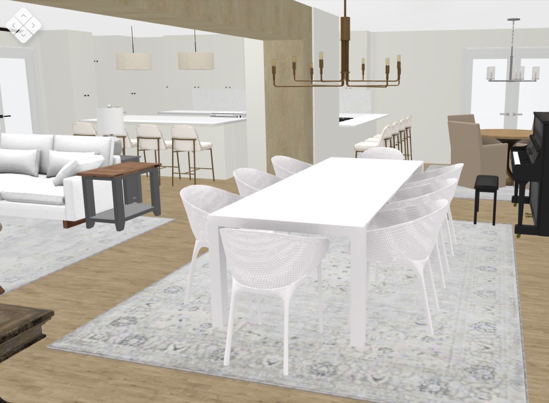 exterior shot turn rug and table 90 degrees wrap beam in dark wood finish