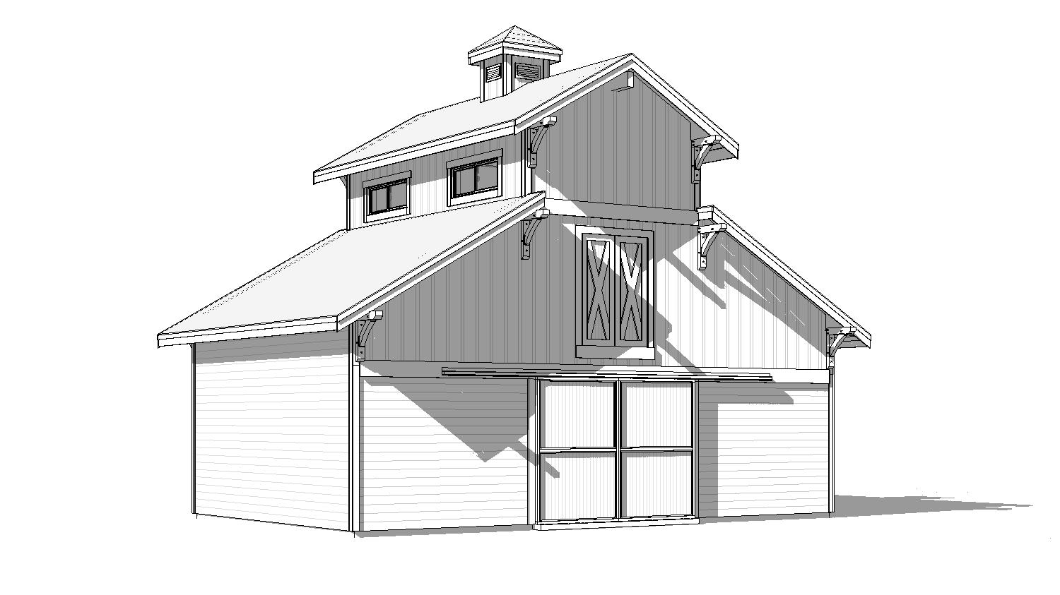 clean architectural exterior rendered in cinematic daylight lighting vertical cedar board batten wood siding with cedar wood barn doors with black trim black metal standing seam roof grass foreground early summer heavy forested area background lush green hills oregon landscape natural wood textures high fidelity photorealistic visualization crisp shadow falloff refined facade geometry richly detailed grain patterns soft atmospheric depth calm minimal landscaping premium architectural photography mood ultra clean composition and materials no grids in windows