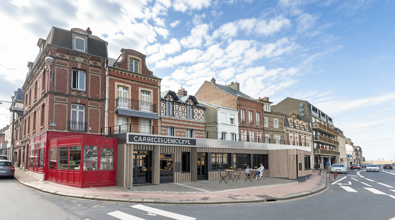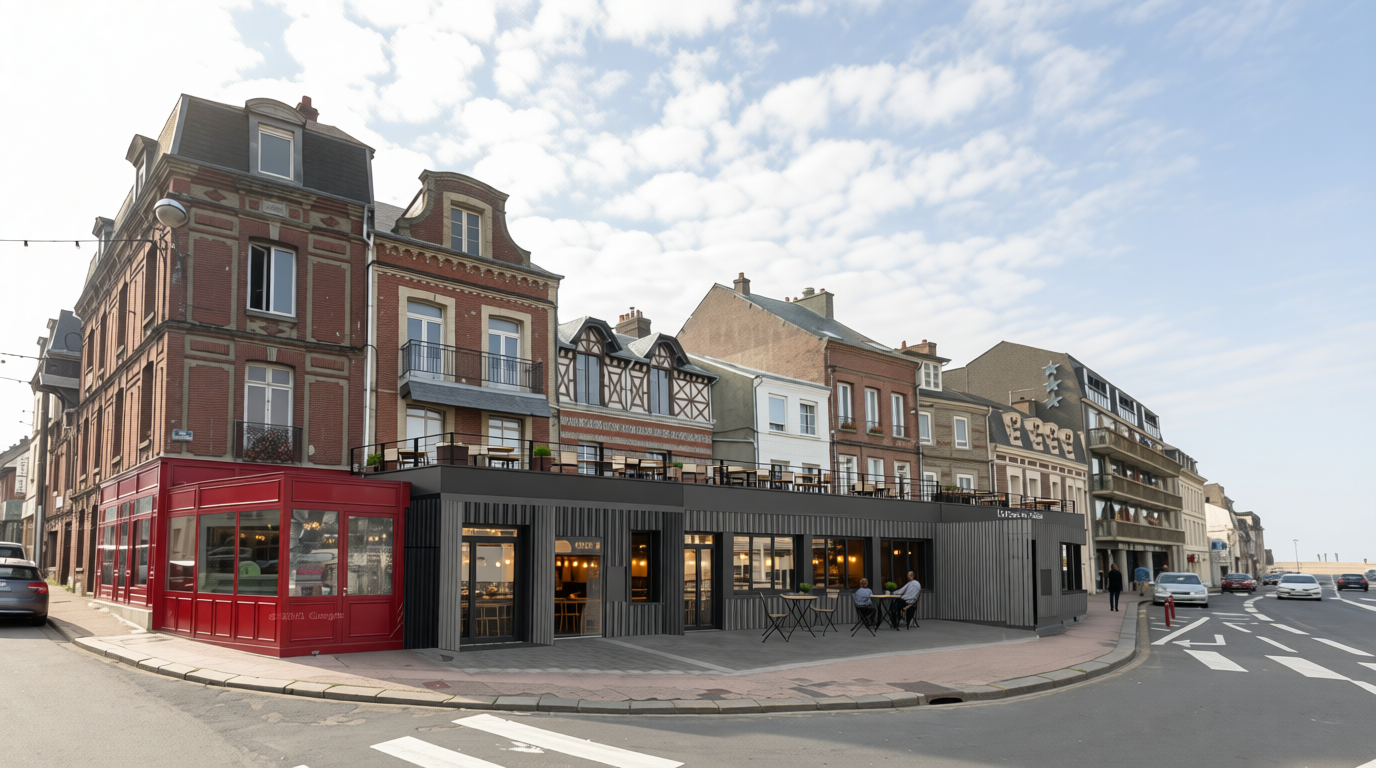 remove the table behind the door of the first gray volume on the left place 5 people on the restaurant s upper terraces and expand the lower terrace with tables and a few people