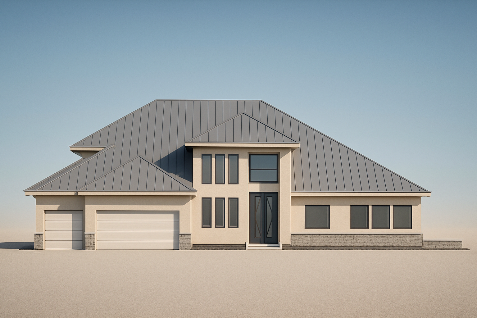 use a black roof with black windows have a black ledgestone with very dark gray brick as shown on reference image have a landscaped grass yard with a sidewalk to the front door and a blue sky background with trees behind