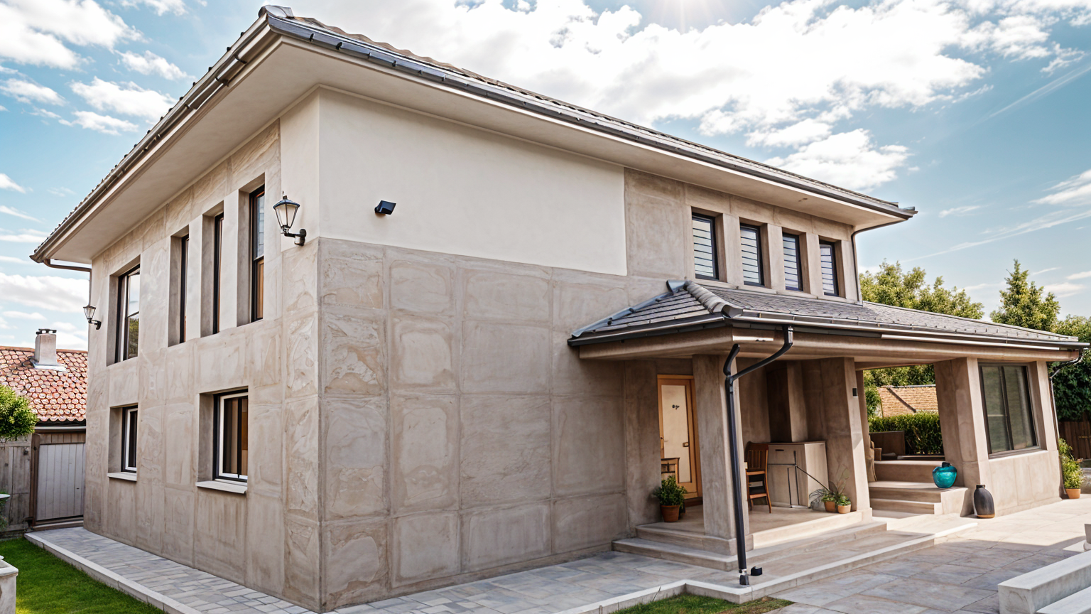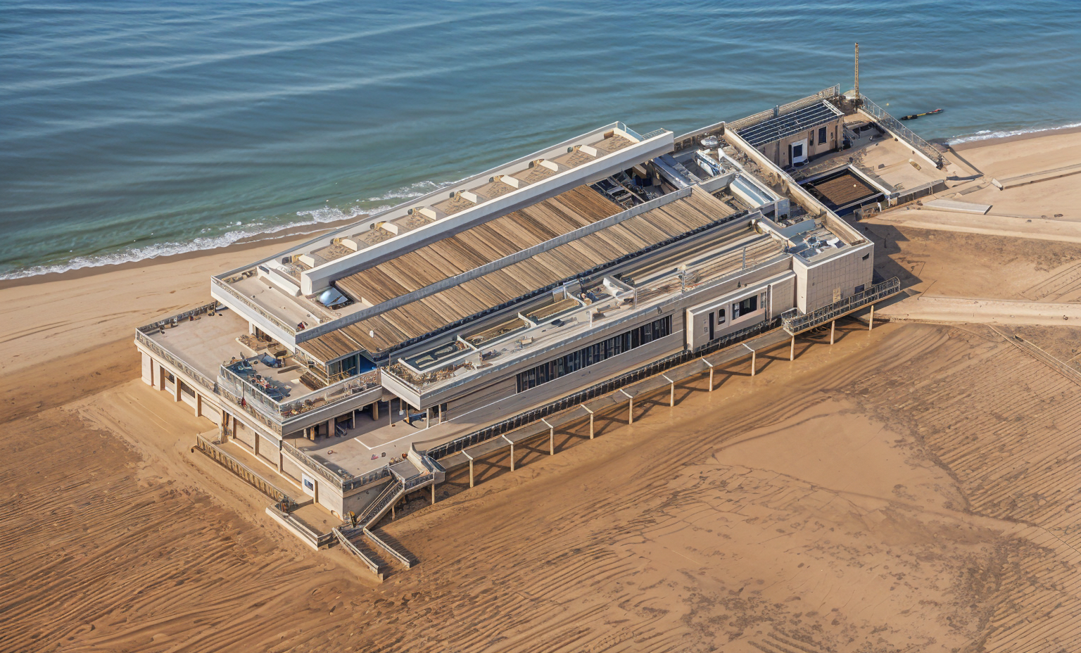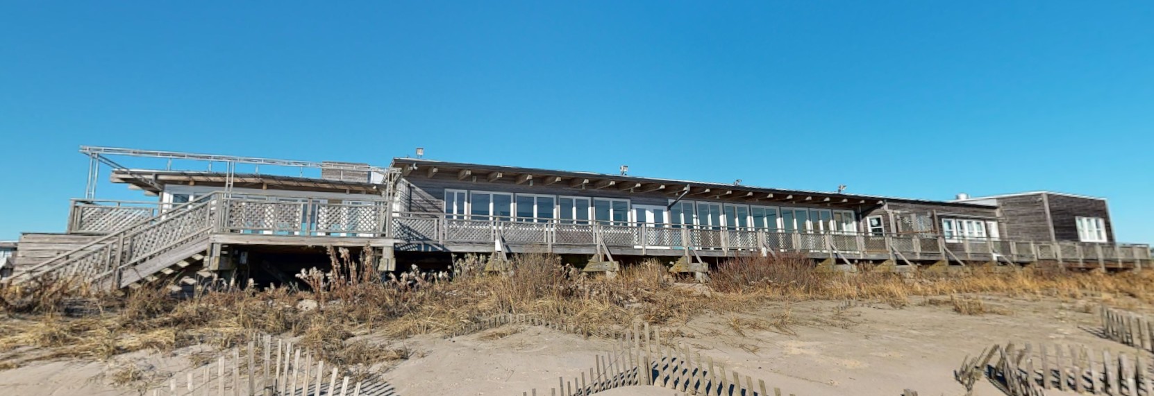 exterior shot this is a catering hall on the beach the main finishes are just weathered cedar it has an epdm rubber roof and the ocean is underneath where the camera point of view is it s not in the background