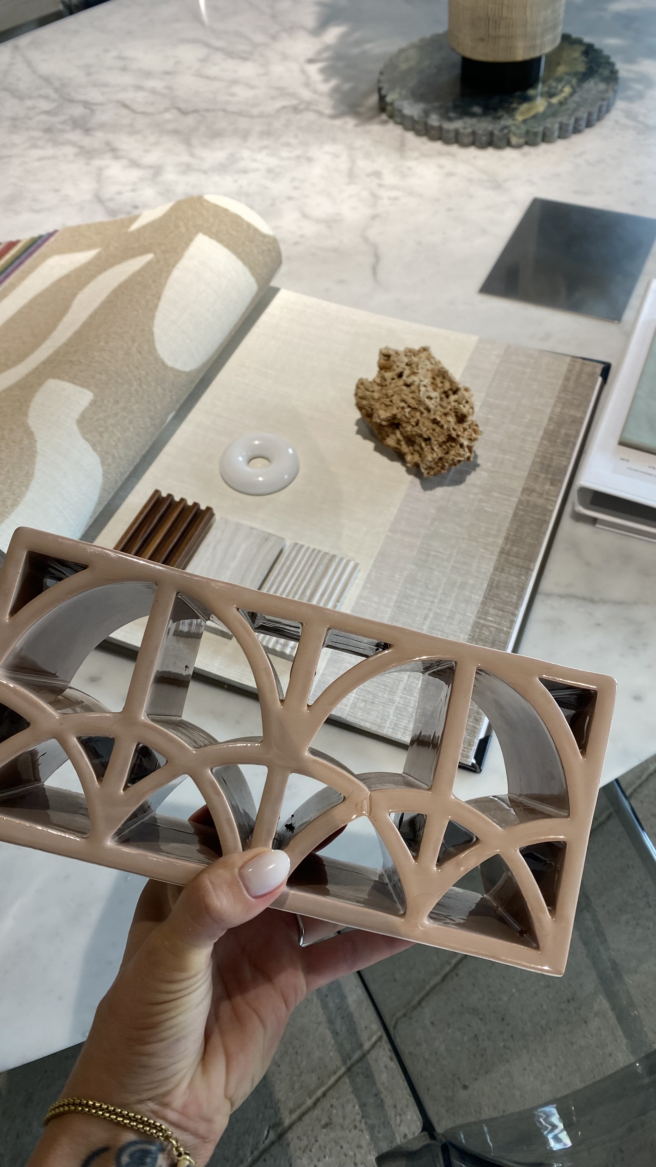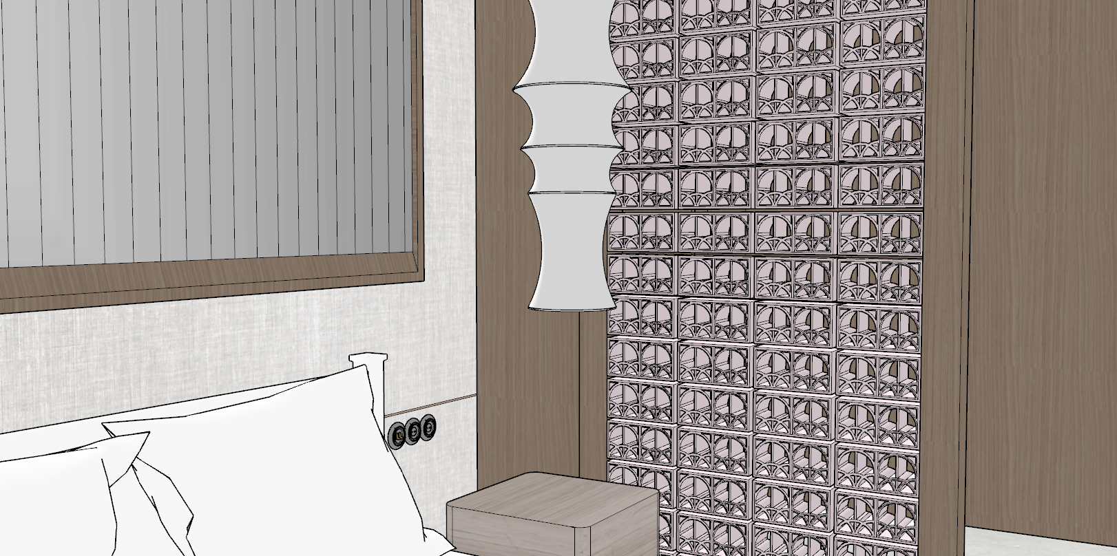 interior shot mirror above the bed comfy bedding openwork wall artemide lamp suspended