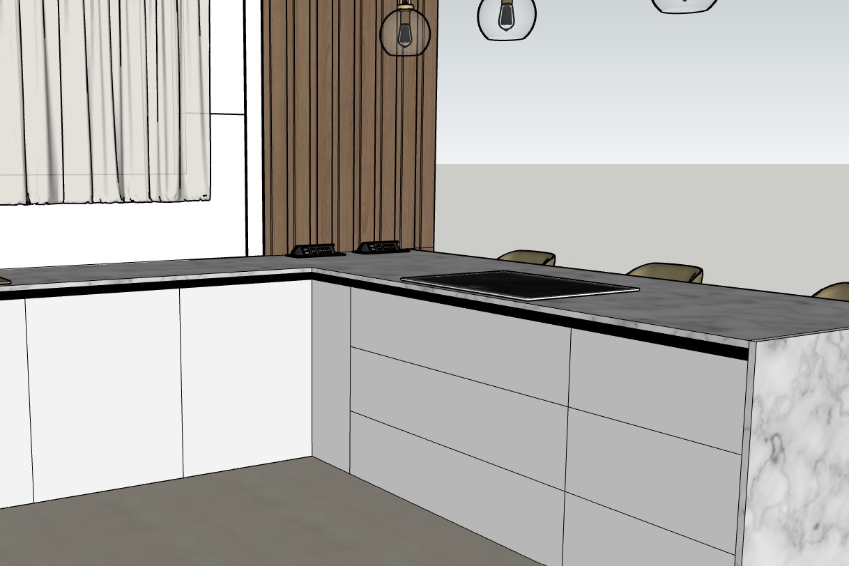 ultra realistic interior render of a modern japandi style kitchen based on the provided sketchup model maintain the exact layout and design kitchen cabinetry in light beige off white matte finish handleless and minimal kitchen island with waterfall edges in onyx beige marble including countertop backsplash marble should have soft warm veining with a refined natural look black kitchen fixtures faucet sink and appliances three pendant lights above the island with black frames and warm bulbs bar stools with wooden legs and light upholstered seats in neutral tones back wall window with sheer off white curtains allowing soft daylight lighting soft natural daylight warm ambient lighting realistic shadows and reflections materials matte cabinetry natural wood grain soft fabric curtains polished marble style minimal warm japandi calm and refined camera eye level slightly angled to show depth of the pantry corner clearly render quality ultra photorealistic high detail