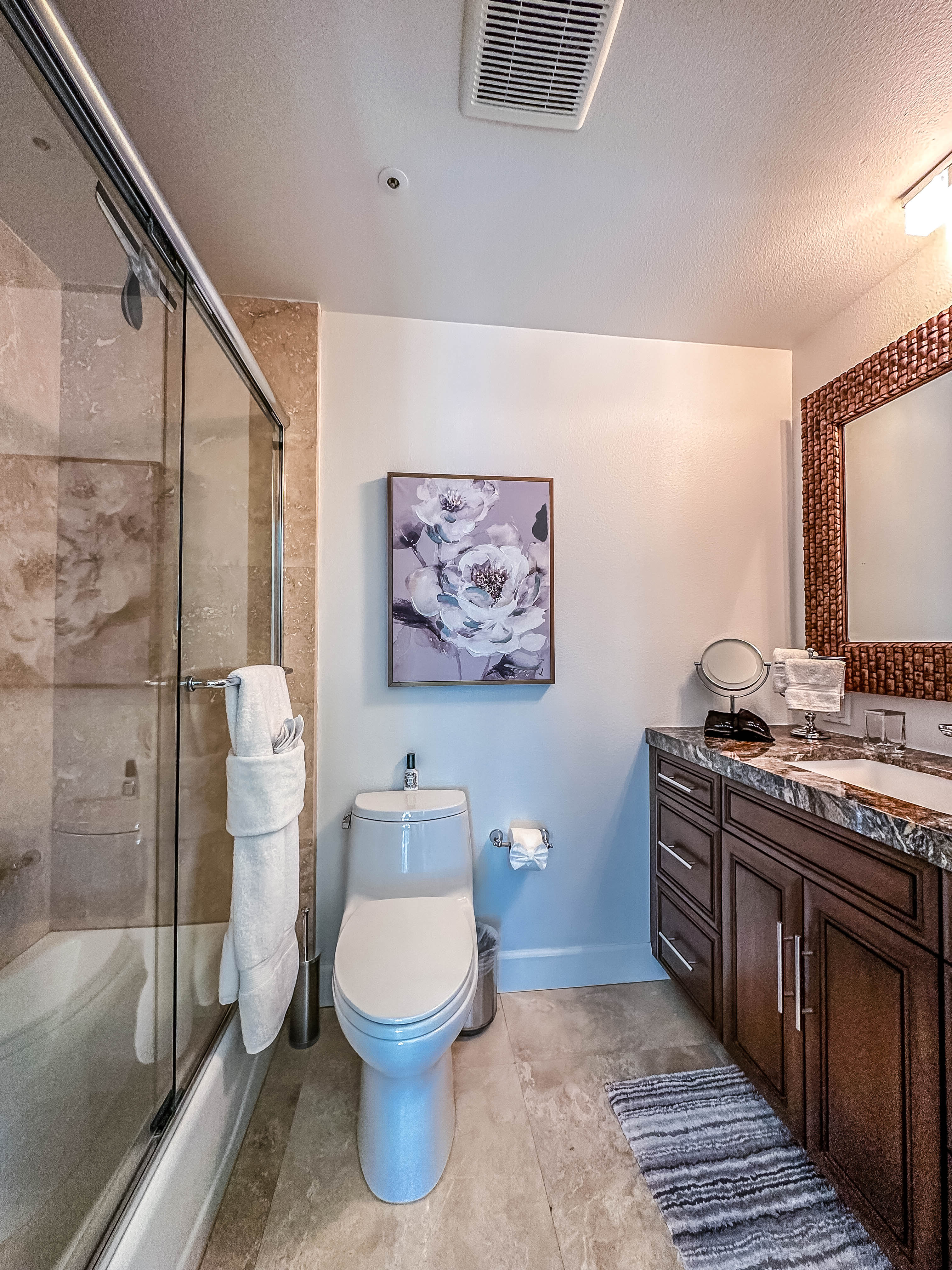clean up ceiling remove a c vent and brighten image remove trash can and toilet brush by toilets keep toilet paper remove black bag on counter remove rug