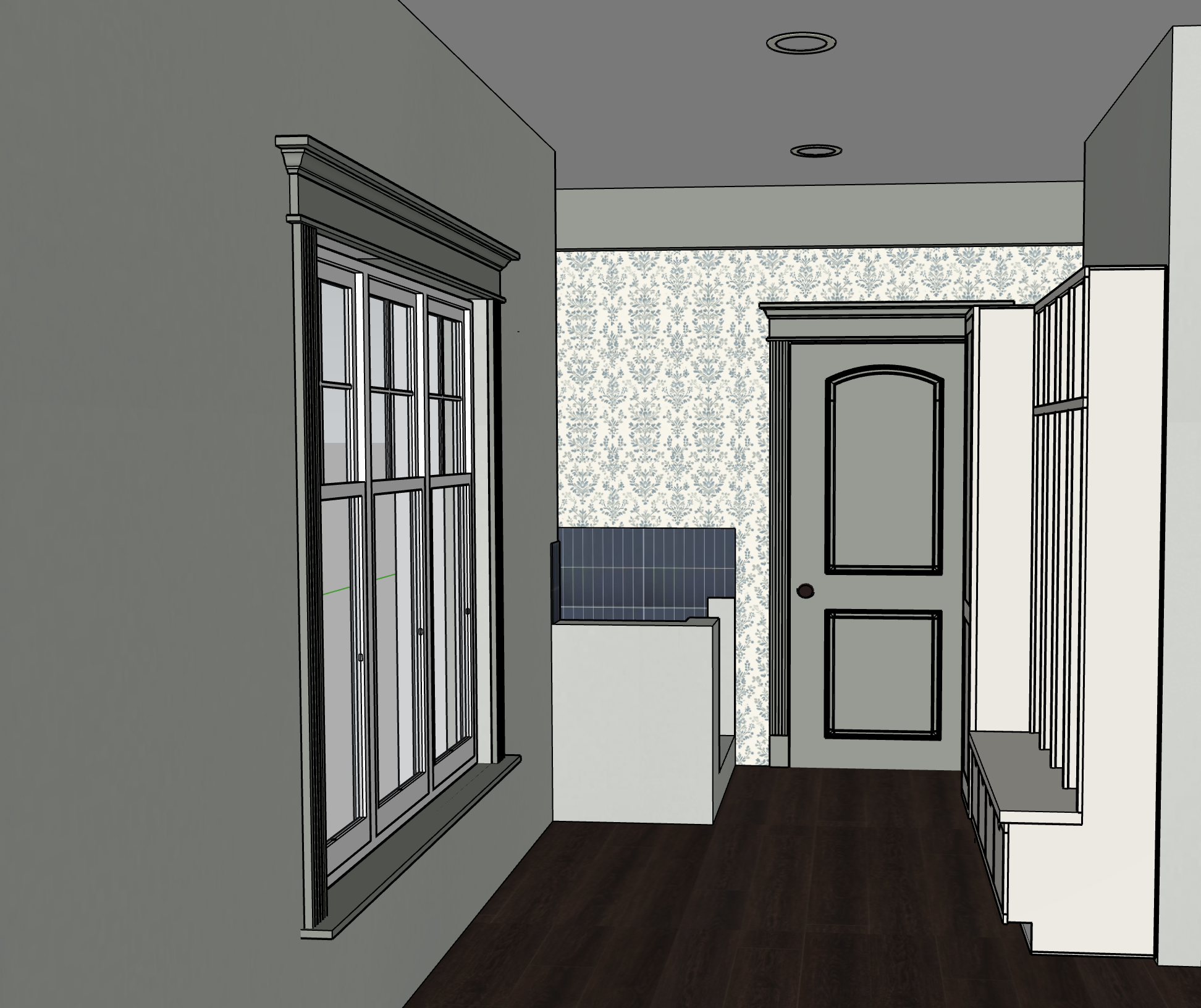 render with indirect midday natural light from window render with 25 recessed light wall color is sherwin williams sea salt door and all trim is sherwin williams oyster bay wallpaper is as shown keep cabinets an off white color
