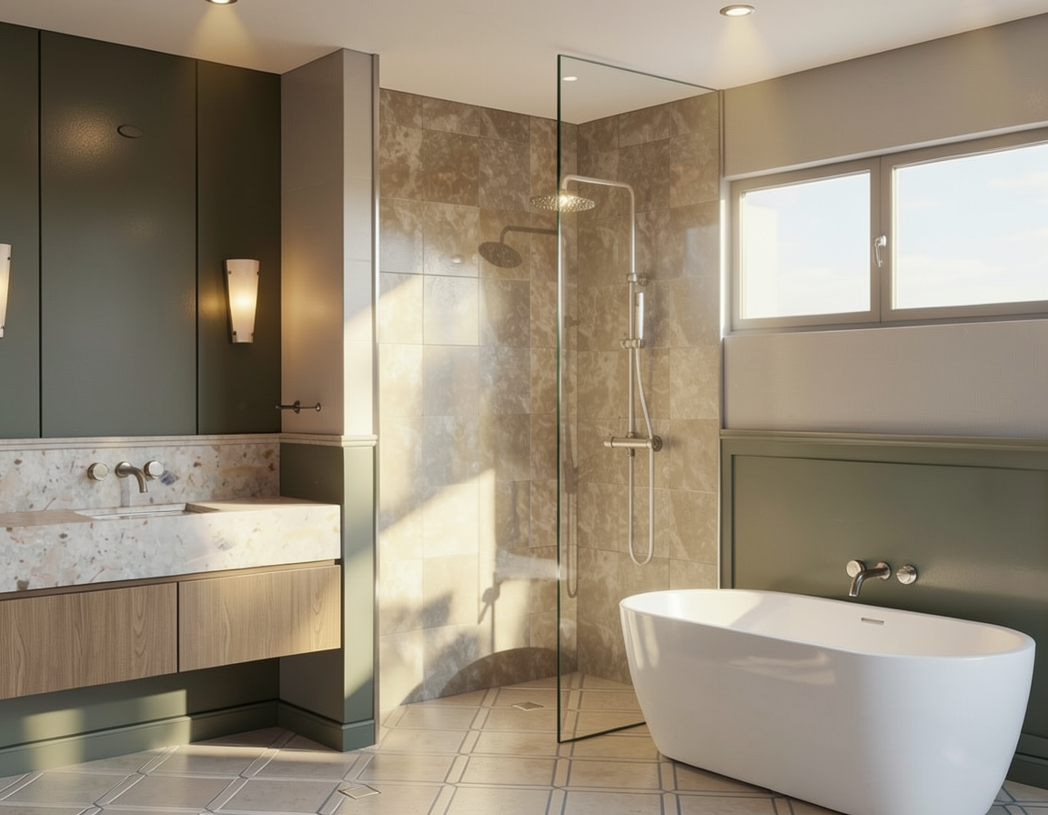 a manicured lawn layered flower beds low maintenance shrubs native plants stone pathway leading to the entrance
