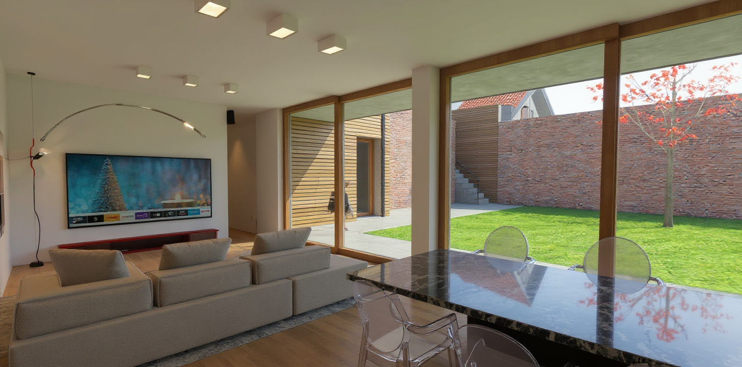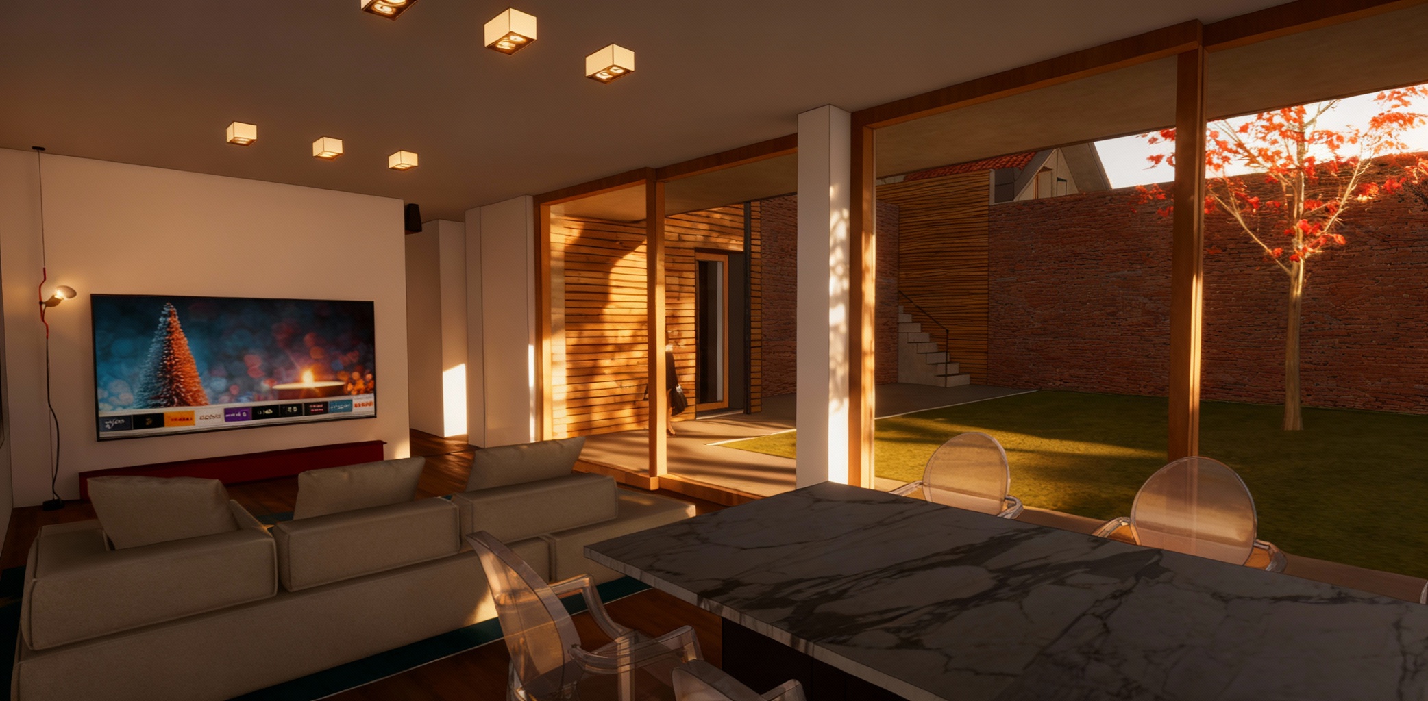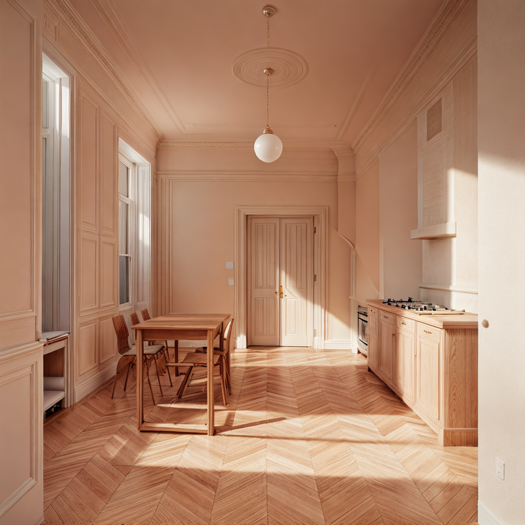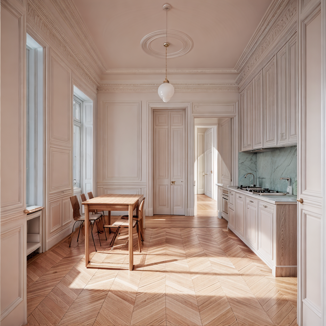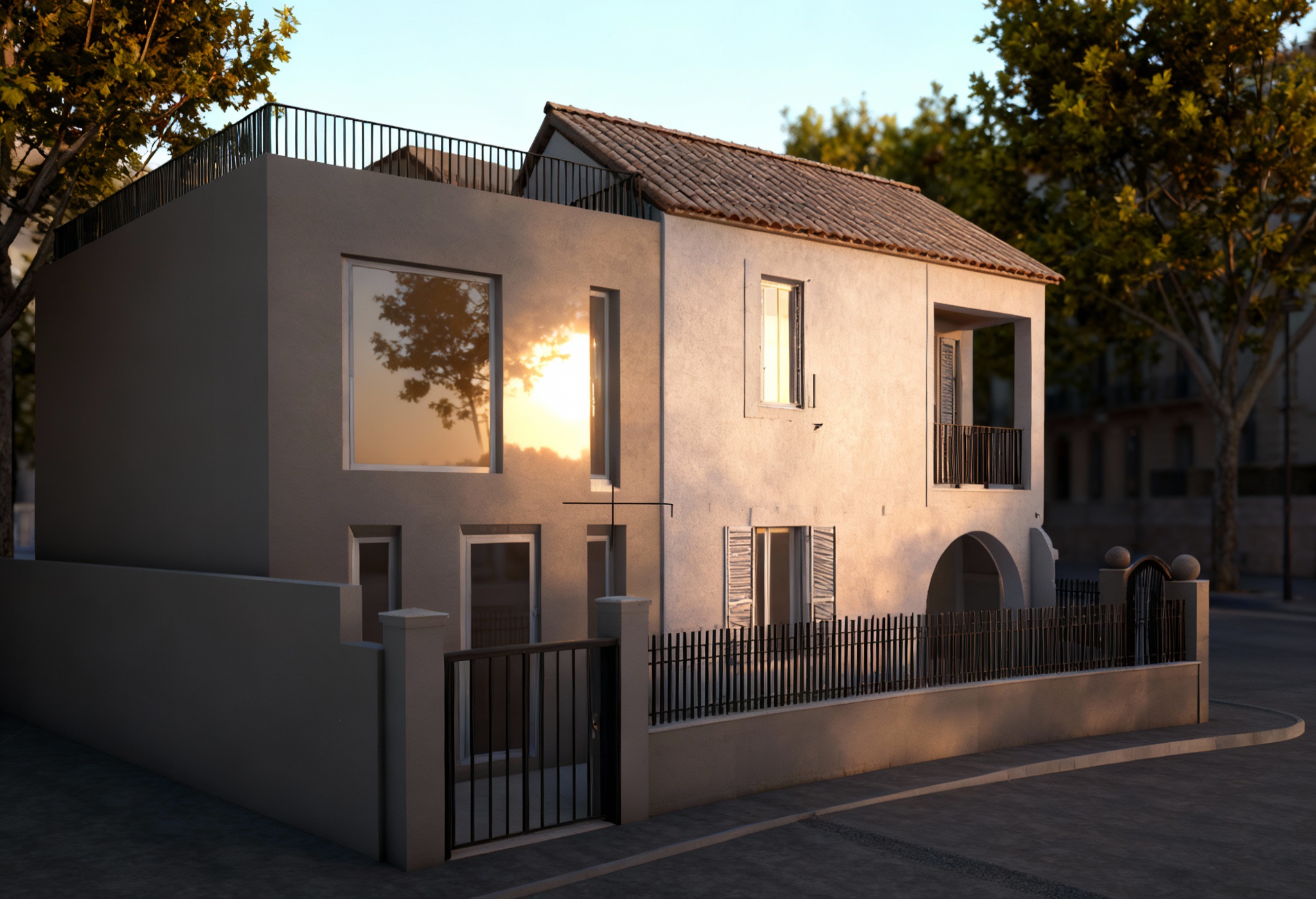 front view of a modern duplex with two garages with separated driveways in front one driveway on the left side and one driveway in the middle in a neighborhood with other duplexes with parking in front use warm beige and taupe tones for the walls with subtle gray stone accents highlight the roof with a dark charcoal gray color add tan trim around the windows and doors the front doors should be a sleek gunmetal gray create a welcoming and serene atmosphere with soft natural lighting surrounded by lush green landscaping and a clear blue sky