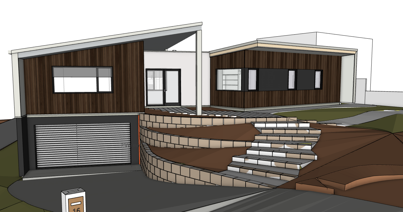 external architecture with dark timber cladding limestone blocks add plants and landscape elements to the garden beds behind the retaining blocks
