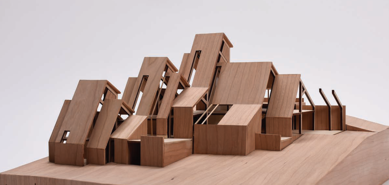 create this architectural model as a cultural center with dark metal roofs and buff stone the building sits in a colorado mountain forest landscape