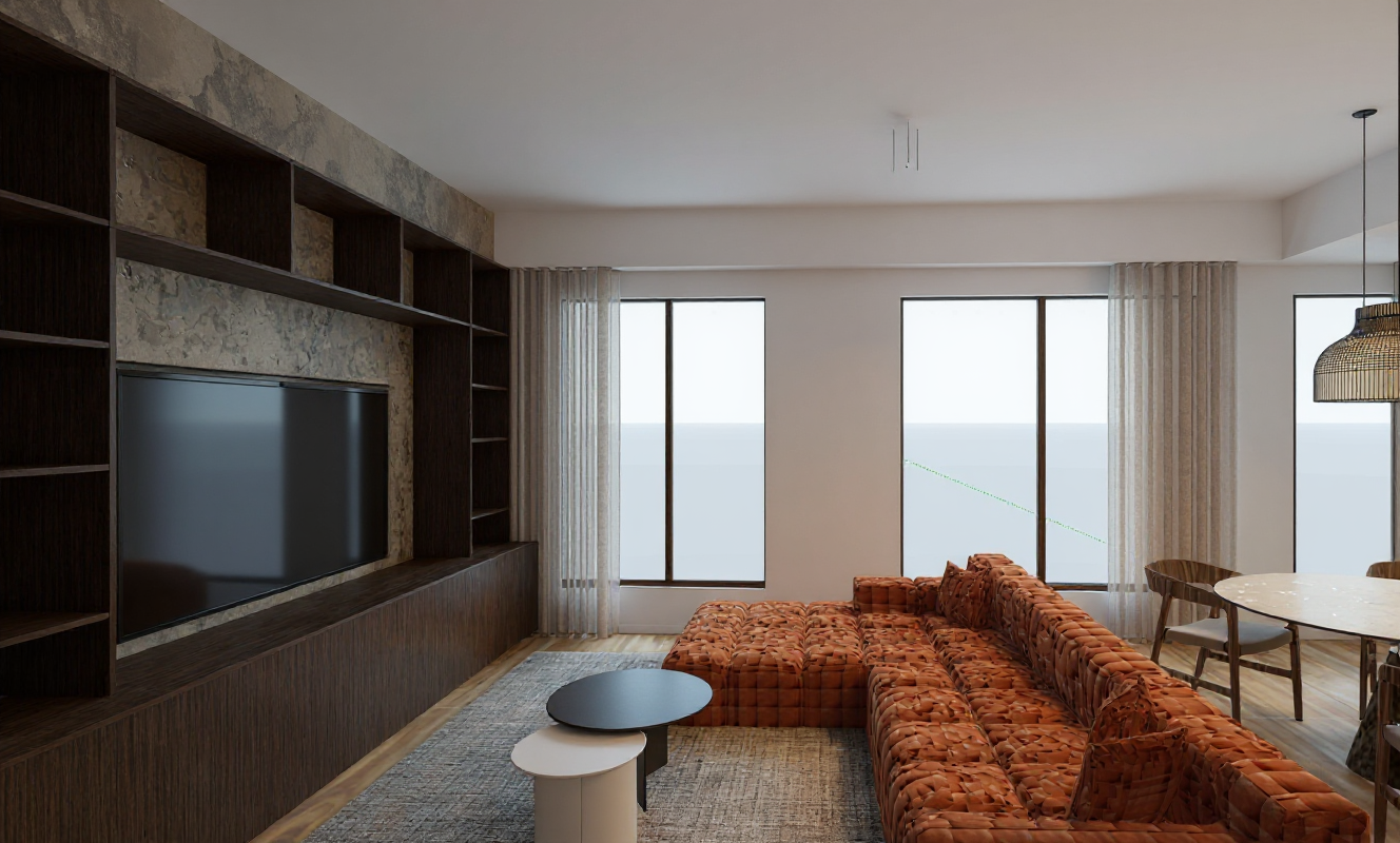 a serene outdoor space under a modern pergola three pendant lights with boho style cast a warm glow the table is set elegantly with wine glasses and a meal sleek black chairs surround the table adding contrast a cozy earth toned sofa invites comfort lush green plants peek out from behind the table enhancing the natural feel the sky transitions from soft pastel pink to light blue with a view of other apartments and greenery creating a tranquil evening atmosphere warm neutral tones dominate the space evoking a sense of relaxed sophistication the veranda is on the 3rd floor high resolution render with daylight only clear