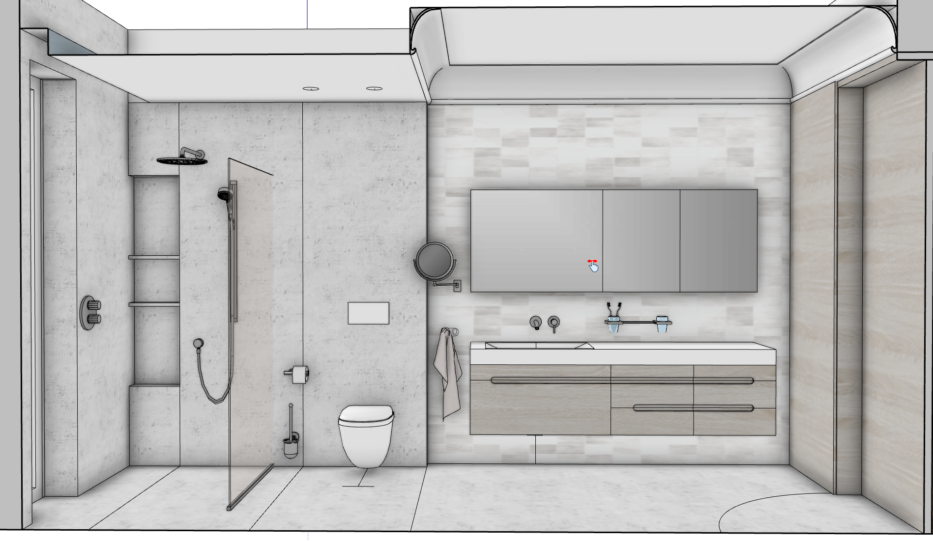 create a modern luxurious bathroom with a spacious layout the shower area features sleek clear glass and dark matte fixtures for a sophisticated look use a soft beige concrete texture for the walls and floors to add an industrial yet elegant feel the vanity wall is adorned with small square tiles in shades of beige and taupe creating a warm textured backdrop choose a large frameless mirror with subtle led lighting underneath for an ambient touch the wooden vanity is in soft bleeched wood tones with clean linear design include a minimalistic white toilet with a contemporary style soft natural lighting should fill the space enhancing the calm and inviting atmosphere
