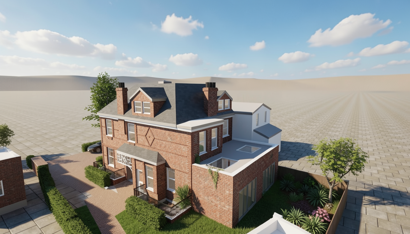 monumental open plan family living space with kitchen area strong low angle morning sunlight washing across hardwood floors and walls bright white ceiling minimal contemporary millwork along one side suggesting the kitchen almost empty space with only one understated seating element no clutter high key exposure wide angle 18mm architectural visualization emphasizing light gradients and spatial calm