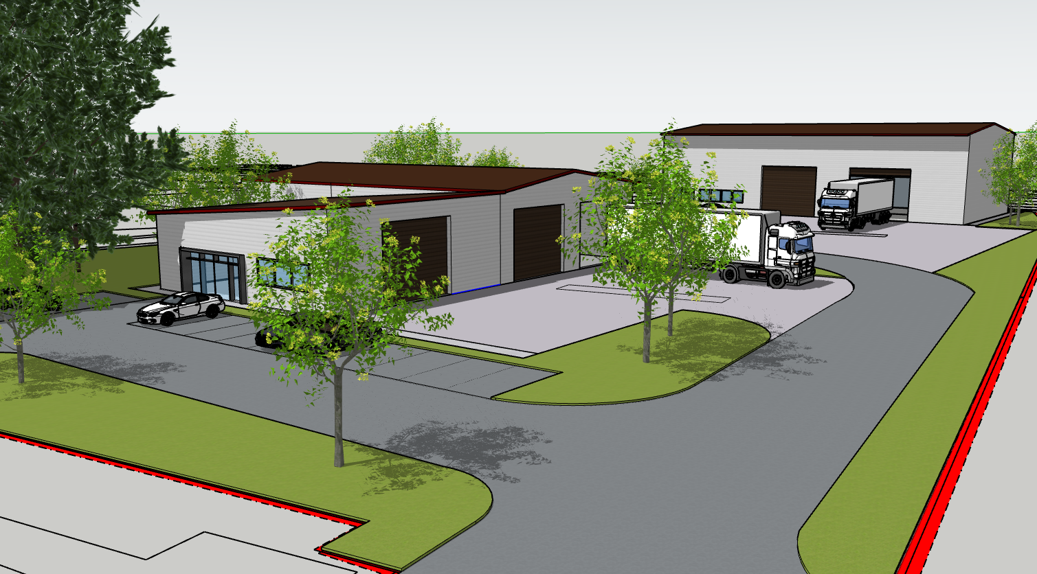 exterior shot photorealistic architectural visualization of a proposed light industrial development in the uk two single storey warehouse buildings with simple rectangular forms light grey white precast concrete panel fa ades dark grey metal trim brown or dark grey standing seam metal pitched roofs large roller shutter loading doors and modest office glazing facing parking areas internal tarmac access road connecting both buildings marked staff parking bays with standard uk vehicles right hand drive cars white vans one articulated lorry positioned at a loading bay concrete service yards and realistic tarmac texture landscaped boundary with mature native uk trees oak birch maple forming a green buffer smaller planted trees along the access road maintained grass areas simple concrete kerbs lighting soft overcast daylight typical of the uk diffused light very soft shadows neutral sky with light cloud cover natural slightly muted colours even exposure context surrounding low rise industrial or commercial buildings in the background subtle uk road markings realistic scale and proportions camera elevated three quarter aerial view accurate and non dramatic perspective style planning submission visual documentary realism photorealistic no cinematic grading no dramatic lighting no stylisation