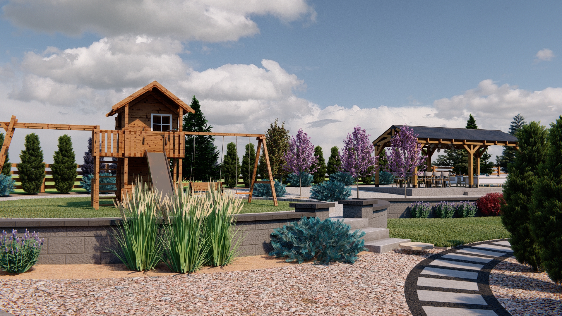 professional architectural photography strictly preserve the original playset and landscaping layout focus on enhancing the foreground materials polished black mexican beach pebbles with realistic wet look reflections and smooth organic shapes deep charcoal tones for the stones enhance the tan decomposed granite and dark mulch textures around the ornamental grasses improve the gray stone retaining wall with realistic concrete block textures lighting natural bright daylight with a high fidelity hdr sky and realistic global illumination 8k resolution photorealistic finish sharp focus on foreground elements