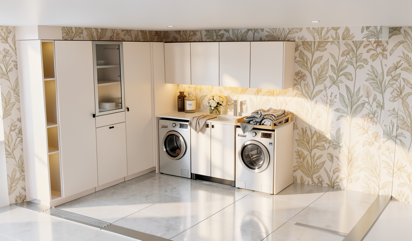 bajar tono en la iluminacion yponer todos los zocalos de los muebles bajosl mismo material y color tono de iluminaci n natural de mediama ana mas clara la imagen suelo mas claro gris mismo papel en la pared tono mas azul tono mas azul claro en el papel de la pared mas azul clarito tono del papel cambiar el tono de azul a azul bebe cambiar papel por un paisaje vegetal azules muy suaves poner zocalo en el mueble del fregadero igual de color que el resto cambiar suelo a gris claro