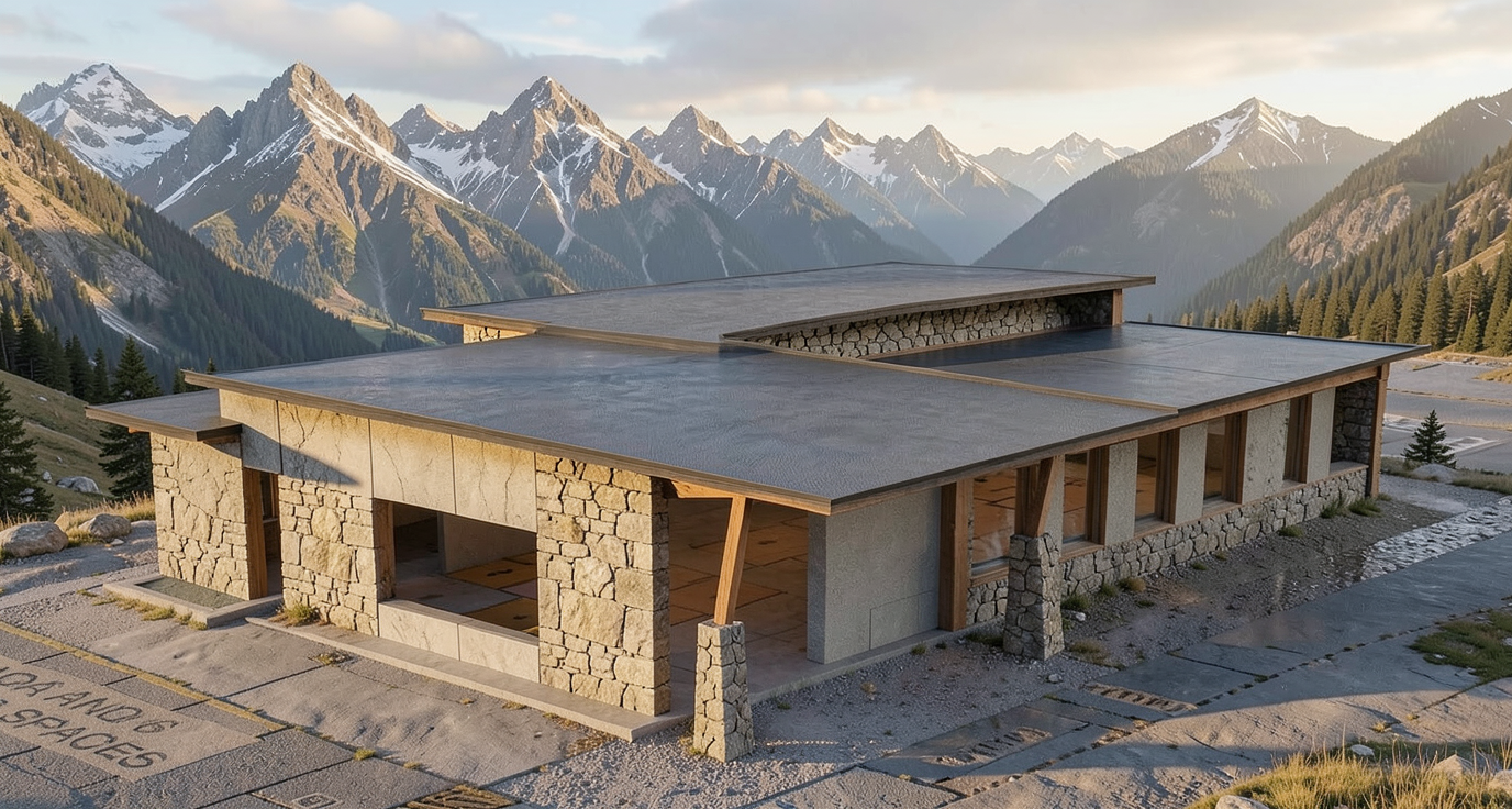 render this image with mountain stone wood brackets make the setting eastern tennessee put glass on openings no mountains in baground